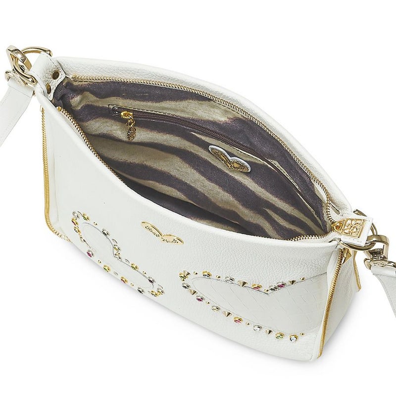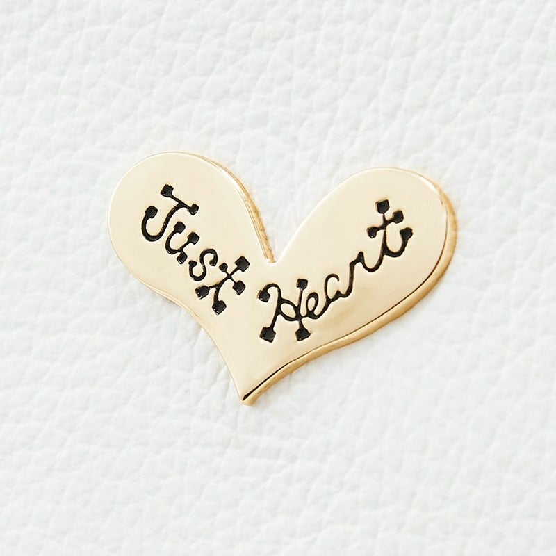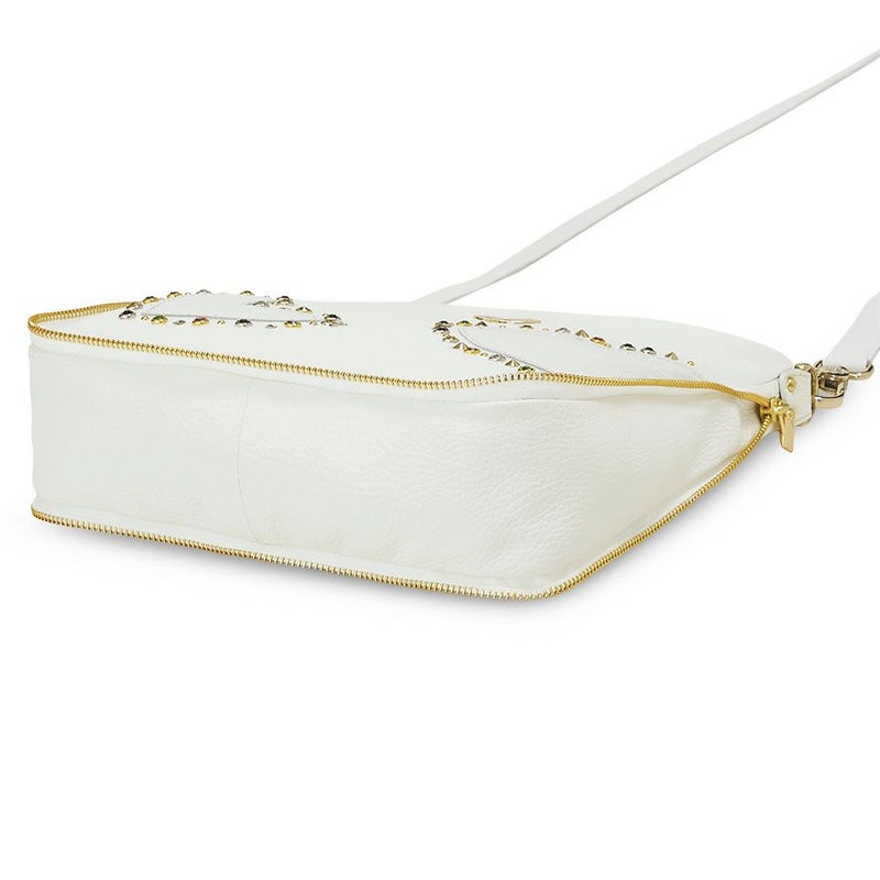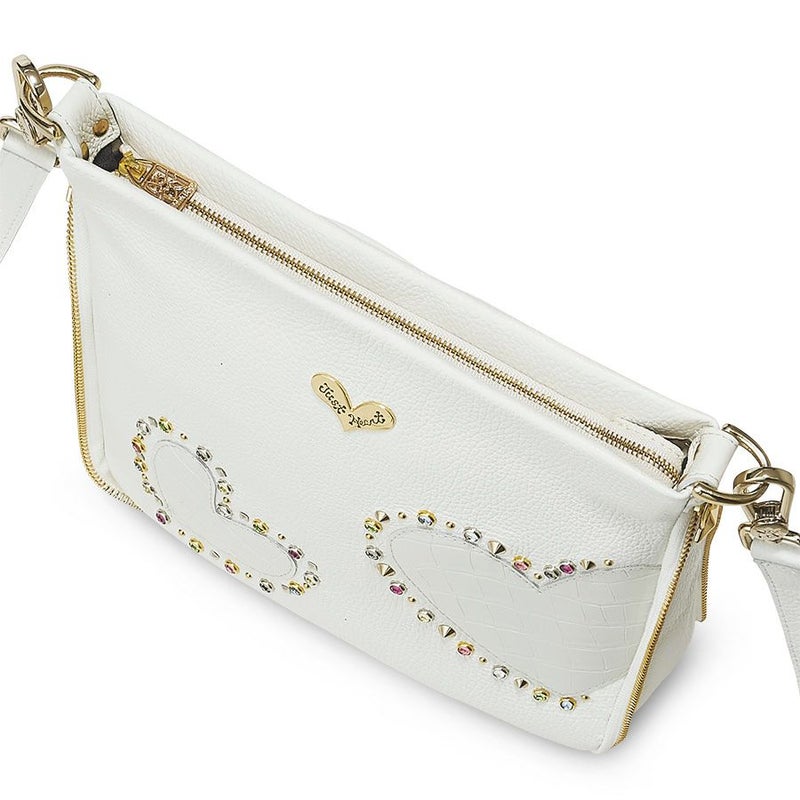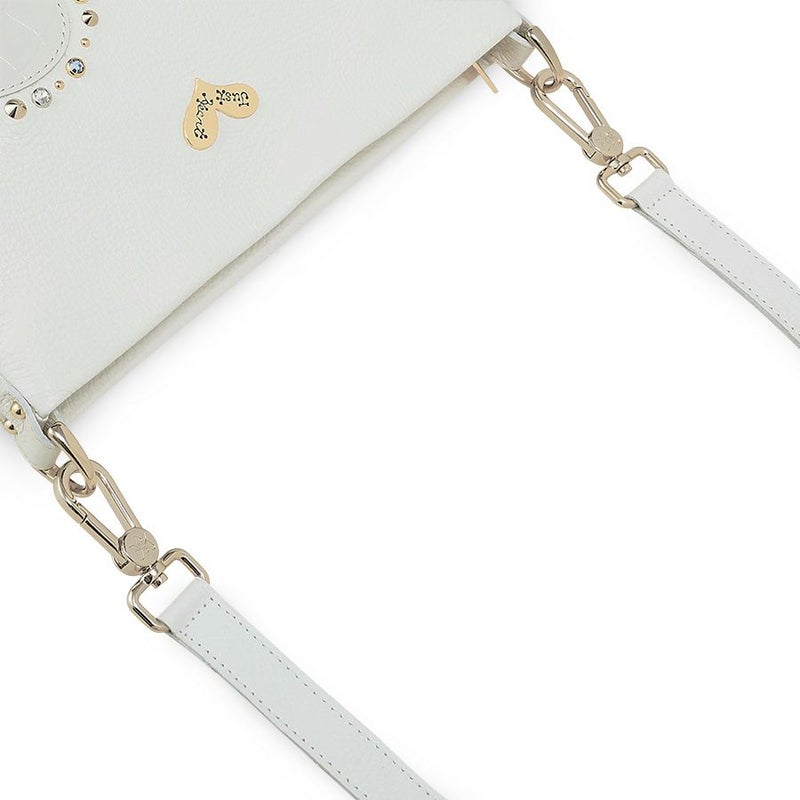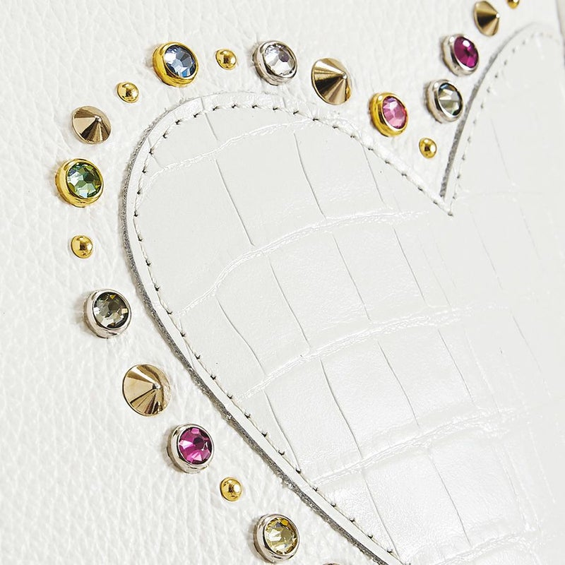細かなシボのあるシュリンクレザーのボディに、艶のあるクロコ型押し牛革のハートをアップリケ。ボディとハートの色をホワイトで統一しながら、素材の質感でコントラストを効かせました。7色のスワロフスキー・クリスタルをはじめ、様々な形のスタッズで透明感のある光のアクセントをプラス。