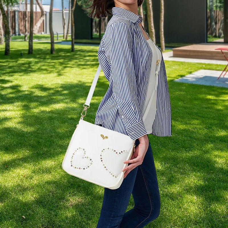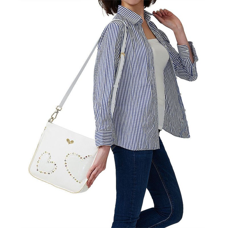 ミラノシリーズが好きでショルダーの黒に続いてホワイト購入。 柔らかな皮にスワロスキーがポイントで春夏用はこれに決まり! 旅行やお出かけ先でいつも褒められます。