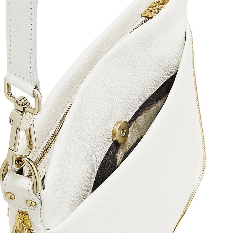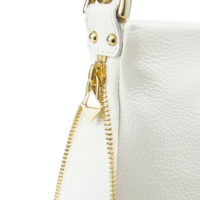 両サイドから底マチまで繋がるWファスナー型の装飾も、デザインのポイントです。クリアなホワイトレザーにゴールドファスナーがエッジの効いたラインを描き、品よくモードな雰囲気。贅沢に使用したレザーのしなやかな質感が、コーディネートをスタイリッシュに見せてくれます。