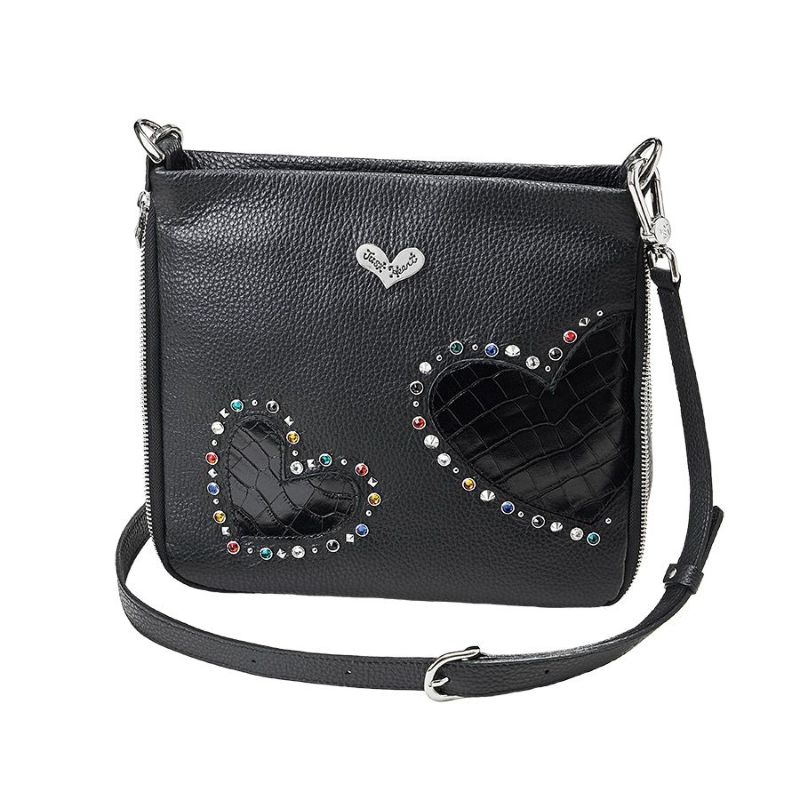 シボのあるブラックの牛革をベースに、艶のあるクロコ型押し牛革のハートをアップリケ。