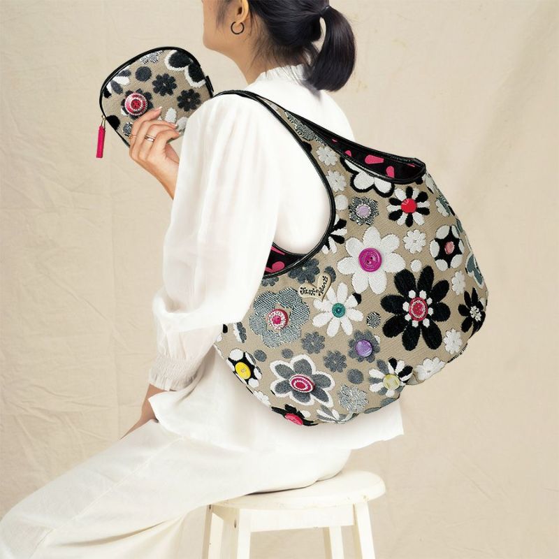 表地はパイルを凹凸に織り込んで柄を表現しているベルギー製の織物で、ふわふわとした手触りが特長。ベージュ地にモノトーンでシックに表現されたマーガレットの中心に配したのは、オリジナルで染め上げた11色のキュートなボタン。