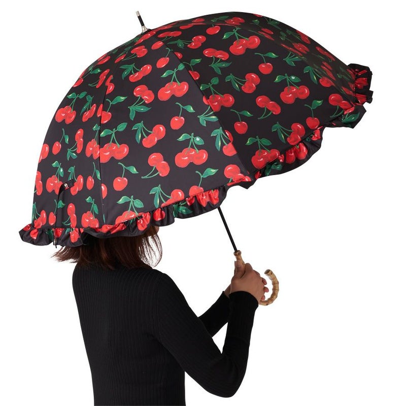 フリルが付いても可愛くなりすぎない落ち着いた雰囲気。ぷっくりとしたチェリーがランダムに鮮やかに映える、インパクトのある大人なチェリーが目を惹く抜群の存在感。