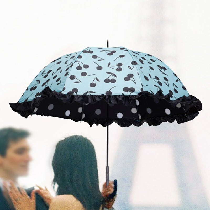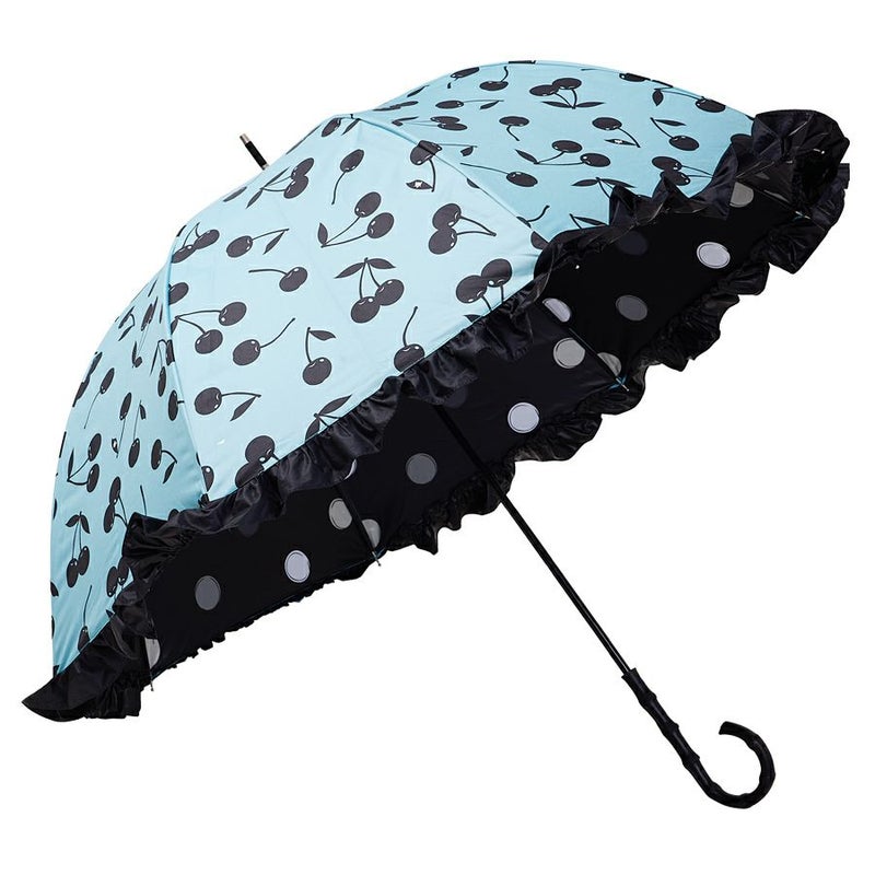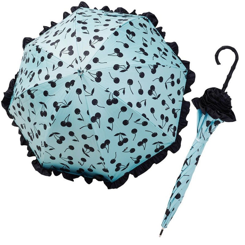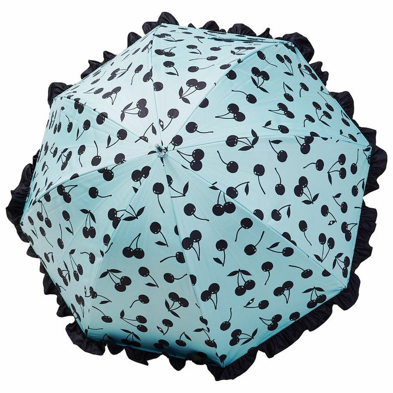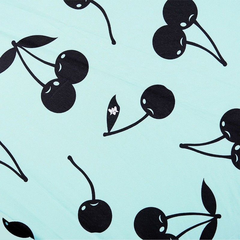 ミントベースにブラックのチェリーを散りばめたシンプルなチェリー柄を、ブラックフリルで囲むことで淡いミントの優しい印象を引きしめつつ、フリル効果でレディ要素をプラスしました。