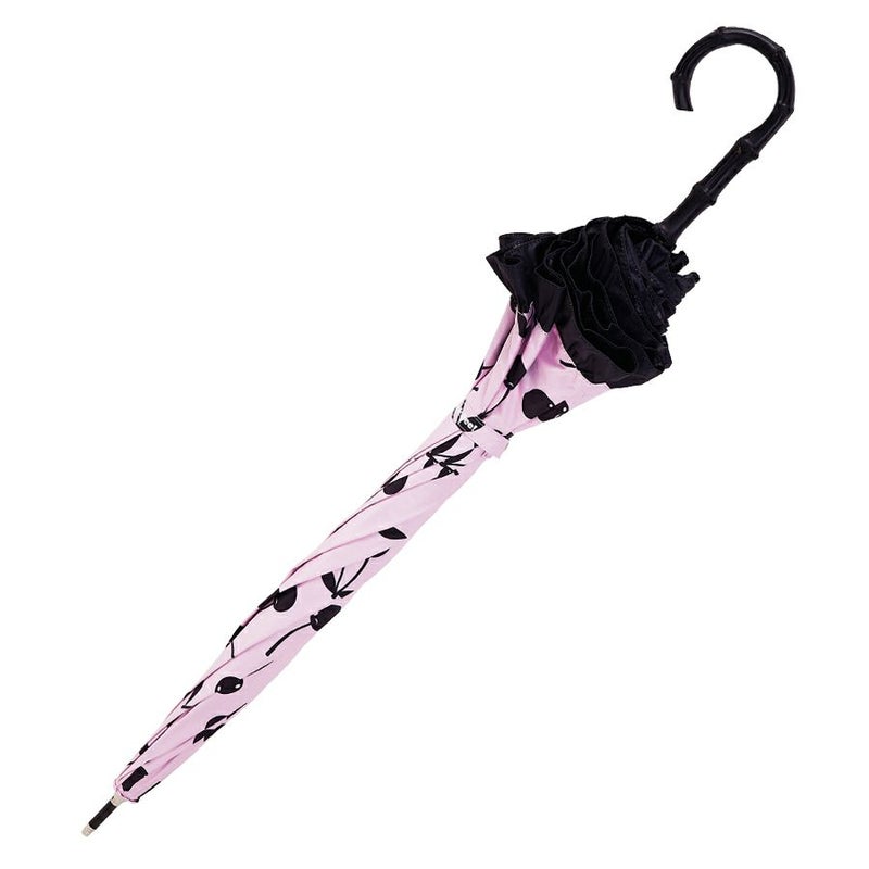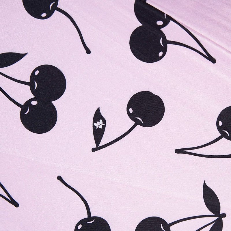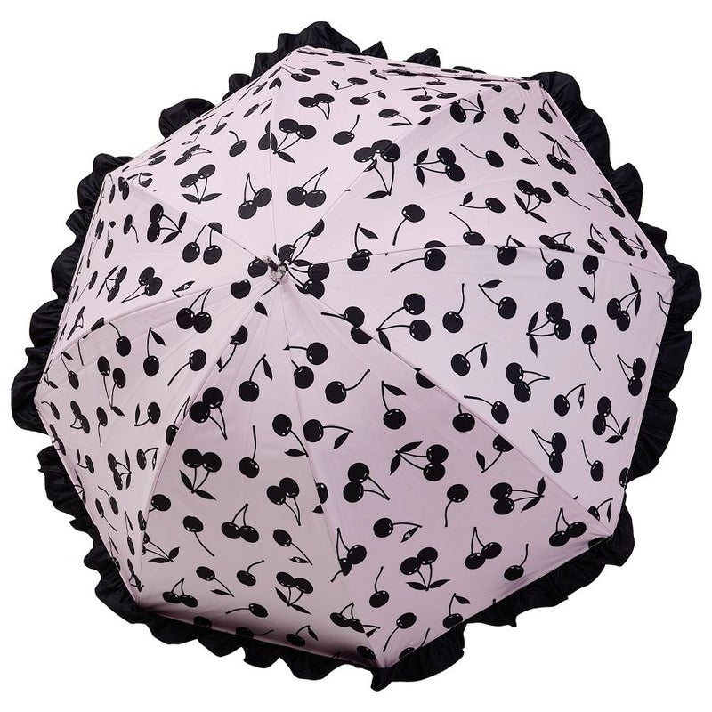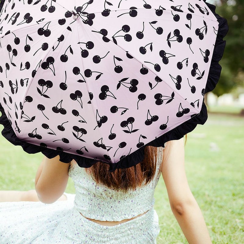 ピンクベースにブラックのチェリーを散りばめたシンプルなチェリー柄をブラックフリルで囲むことで、淡いピンクの優しい印象を引きしめつつ、フリル効果でレディ要素をプラスしました。