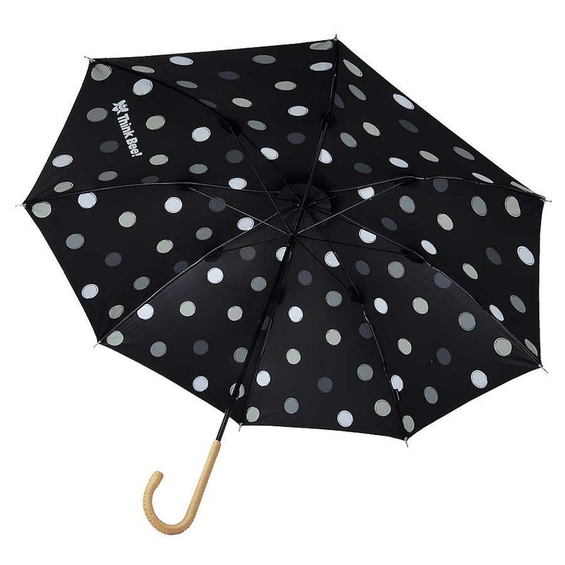 表布はもちろん裏布もオリジナル。傘を開けると遊び心たっぷりのドット柄にThink Bee!のロゴをあしらいました。