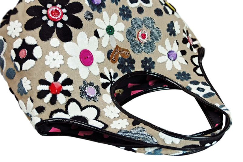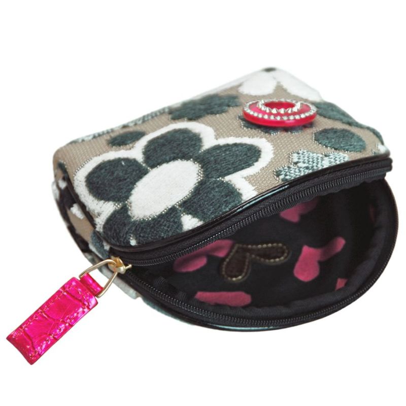 表地はパイルを凹凸に織り込んで柄を表現しているベルギー製の織物で、ふわふわとした手触りが特長。ベージュ地にモノトーンでシックに表現されたマーガレットの中心に配したのは、オリジナルで染め上げた11色のキュートなボタン。