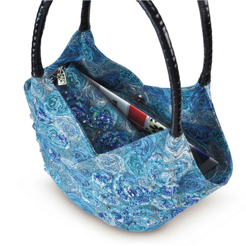 表地は鮮やかなブルーの濃淡で表現した薔薇が全面に描かれたデザイン。柄の上にはスワロフスキー・クリスタルやビーズ、スパンコールを手刺繍で繊細かつ贅沢に散りばめました。