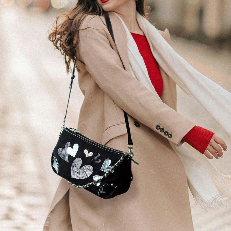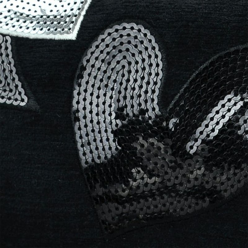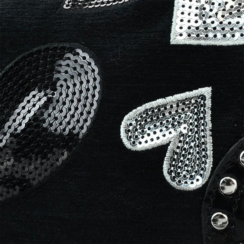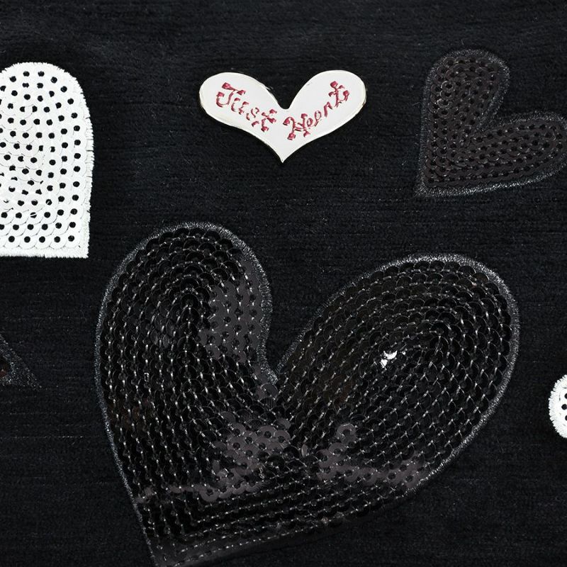 手触りの良いトルコ製の生地に、シルバーやブラックのスパンコールをハート型に敷き詰めて刺繍しました。