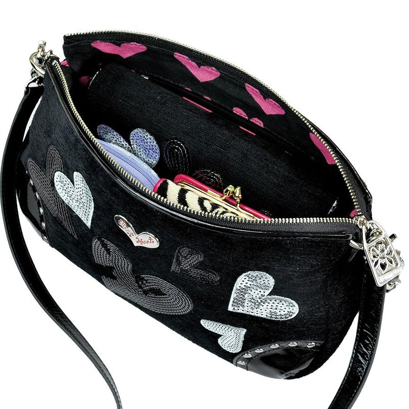 内側にはハート柄のプリント生地を使用した、ポップで楽しい雰囲気。ファスナー付ポケットとオープンポケットが1つずつ付いています。
