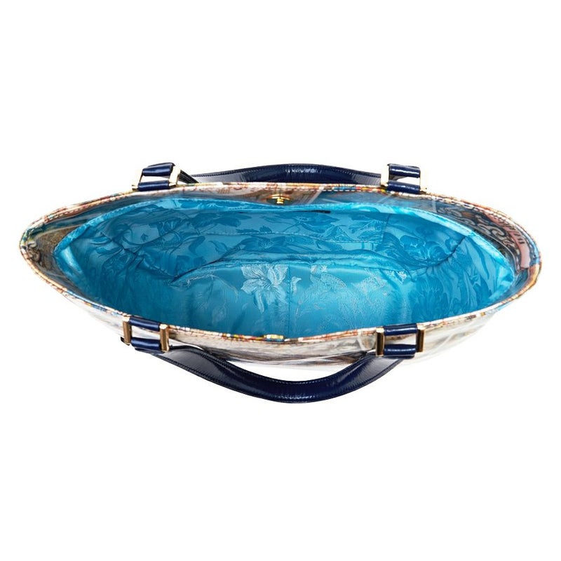 裏地はシックな表地に対して、鮮やかなアクアブルーの花柄ジャカード織生地を使用。華やかで中身が見やすいのも嬉しい。