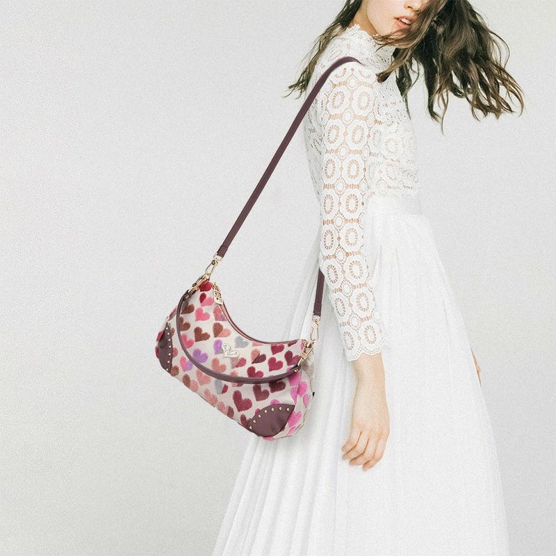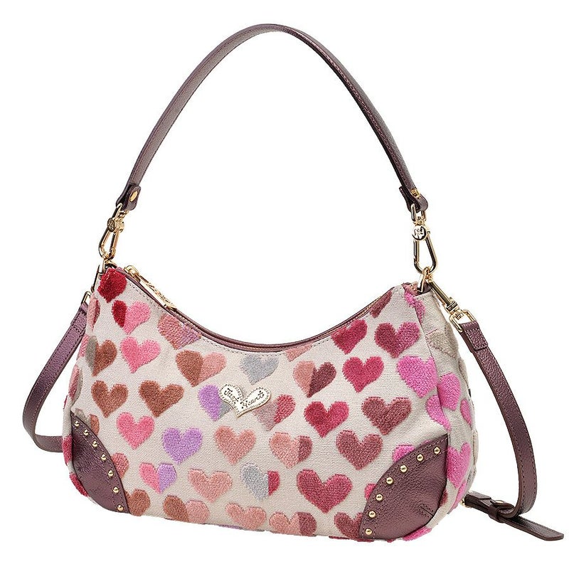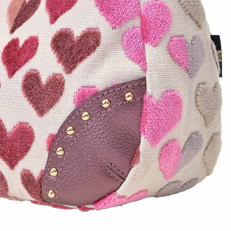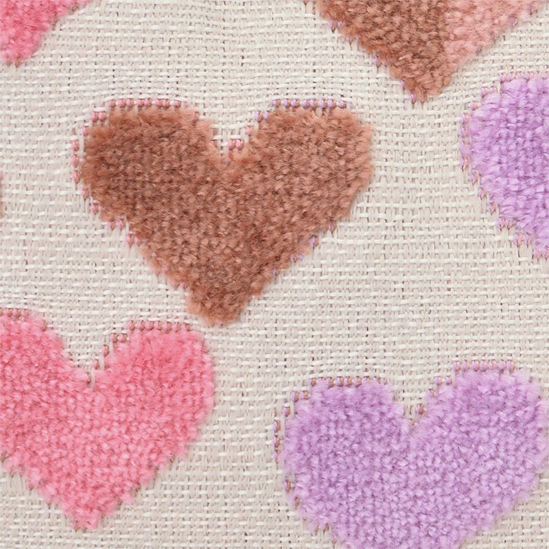 ボディに使用したのはベルギー製の織生地。ピンク系にパープルとライトグレーが混じり合う表情豊かなハート柄生地は、パイルを凹凸に織り込んで柄を表現したふわふわと柔らかい質感が特徴です。