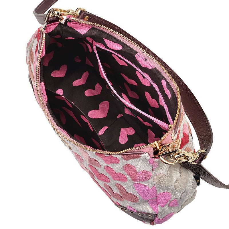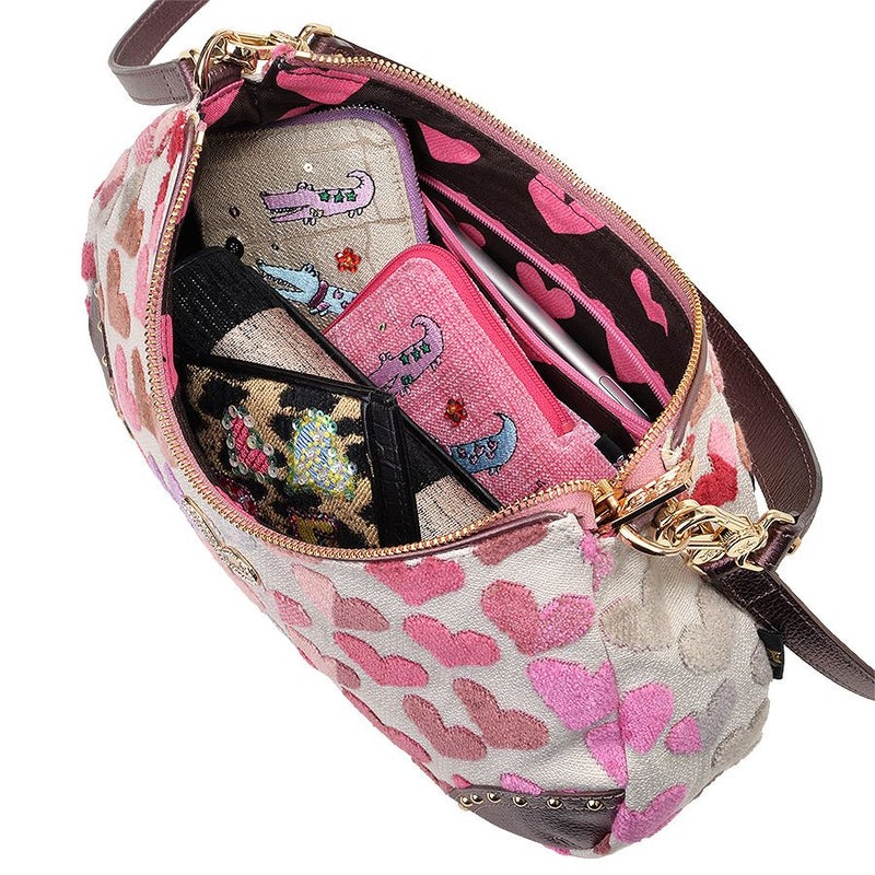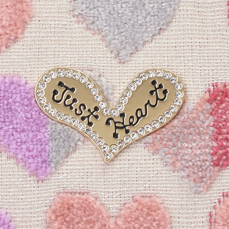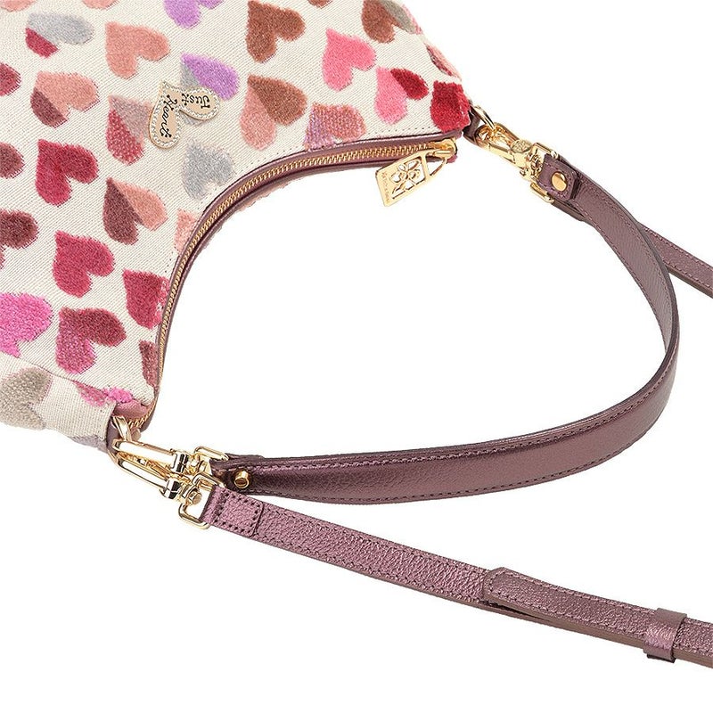 開口部は安心のファスナー式で内側もハート柄のプリント生地を使用し、ポップで楽しい雰囲気。