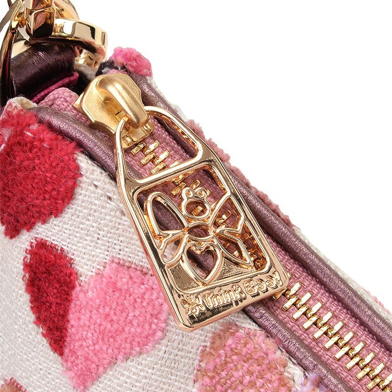 背面にはすぐに取り出したい時に便利なファスナーポケット付いており、開けると内部もキュートなハート柄のプリント生地。