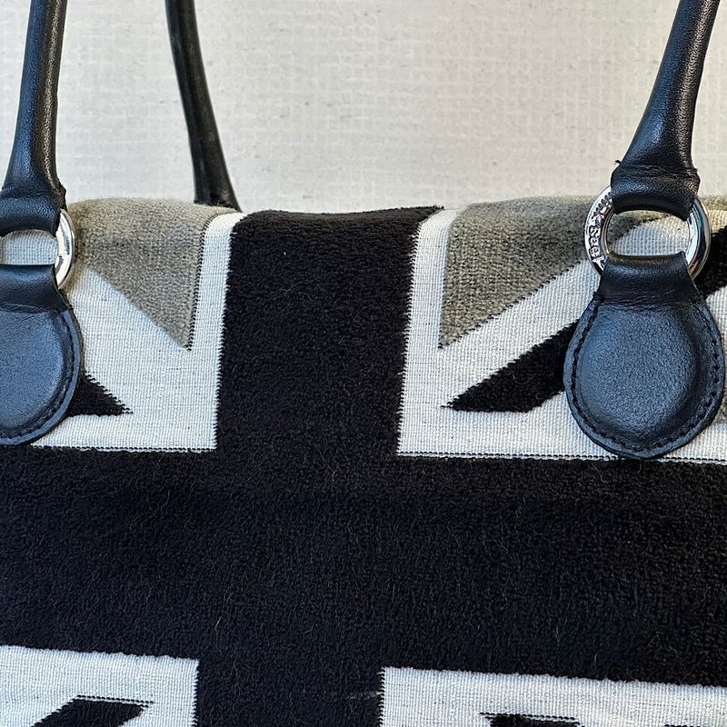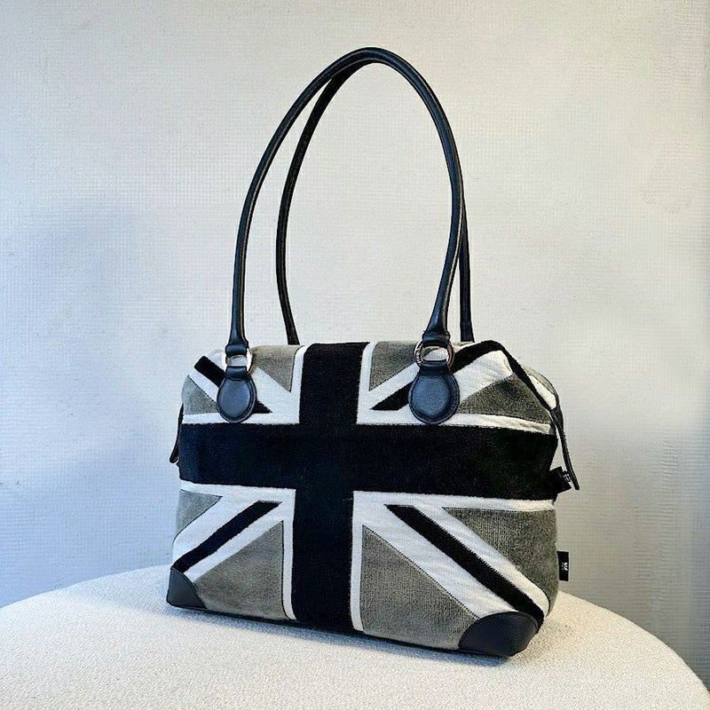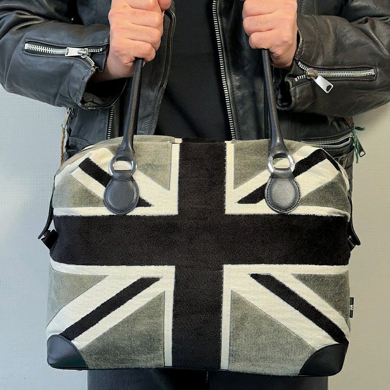 ブラック×グレーのベルギー製ユニオンジャック柄ベルベットが、クールで存在感のある外見を作り出す。