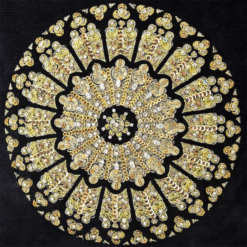 薔薇窓を様々な角度から写真撮影するところから、色彩を忠実に割り出して再現性にこだわり、世界最高峰の技術を誇る、中国・スワトウの技術と職人が丹精をこめて手刺繍を施した、ブルー(A002771)ピンク(A003819)に続いて、ゴールドが登場。