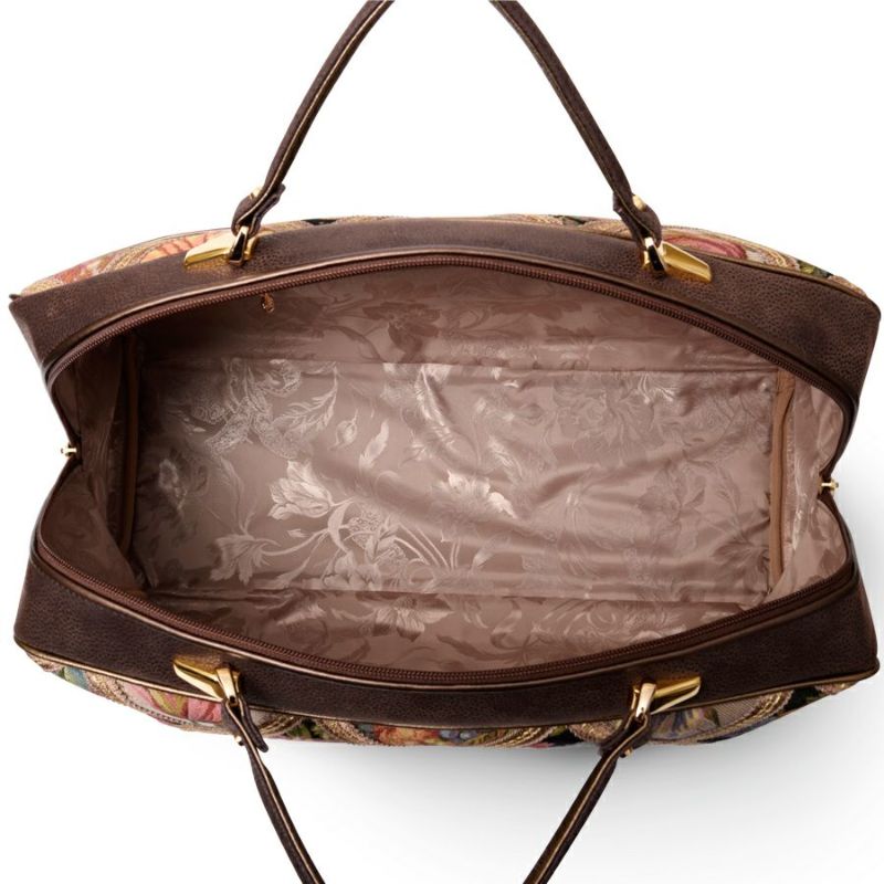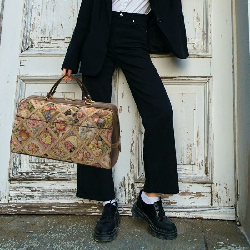 | 素材 | | 表地原産国 | イタリア | | 表地 | ビスコース70%・アクリル21%・ポリエステル7%・ナイロン2% | | 裏地 | ポリエステル100% | | ハンドル | 合成皮革 | | その他 | - | | サイズ(約) | | 本体(突起部を除く最大) | H 26 × W 46 × D 20 cm | | ハンドル立ち上がり | 11.5 cm/- | | ショルダーストラップ長さ | -/- | | 重さ | 920g | | | 仕様 | | 開口部 | ダブルファスナー式 | | メイン室 | 1 /- | | 内側 | ファスナー付ポケット×1・オープンポケット×2(内携帯電話サイズ×1) | | 外側 | オープンポケット×2 | | ハンドル | 2 /- | | 底鋲 | 5 | | その他 | 作品により柄の出方が異なる場合があります | | 補足情報 | | - | |