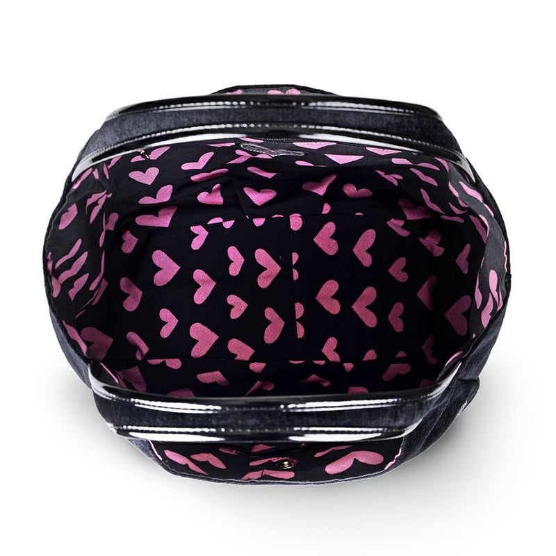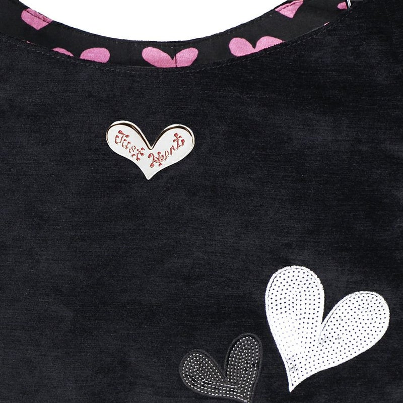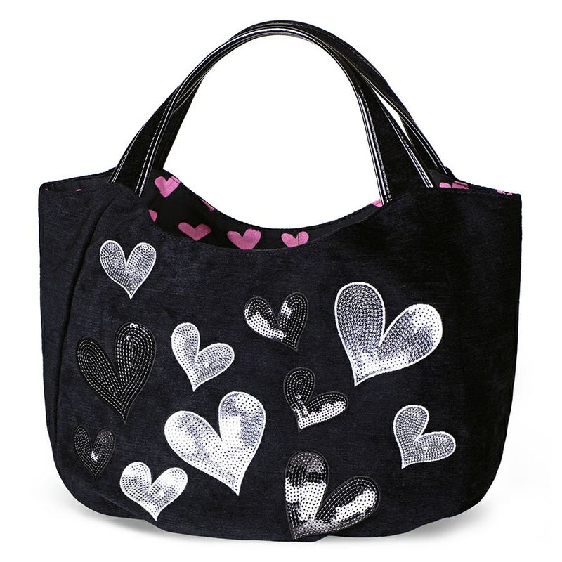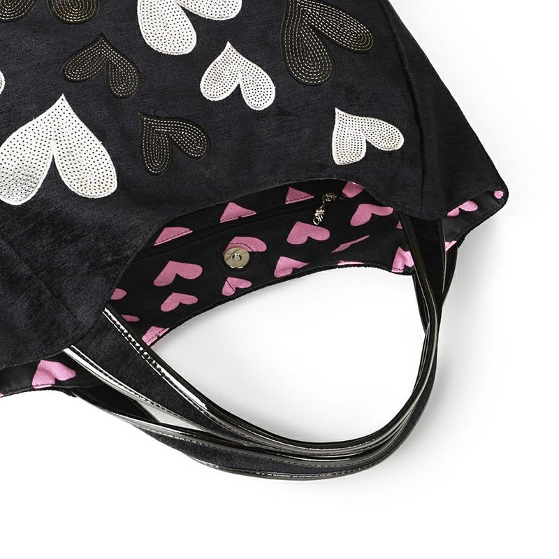 光沢のあるブラック地に、シルバーやブラックのスパンコールをハート型に敷き詰めて刺繍した、シンプルながらもインンパクトのあるシリーズ。
