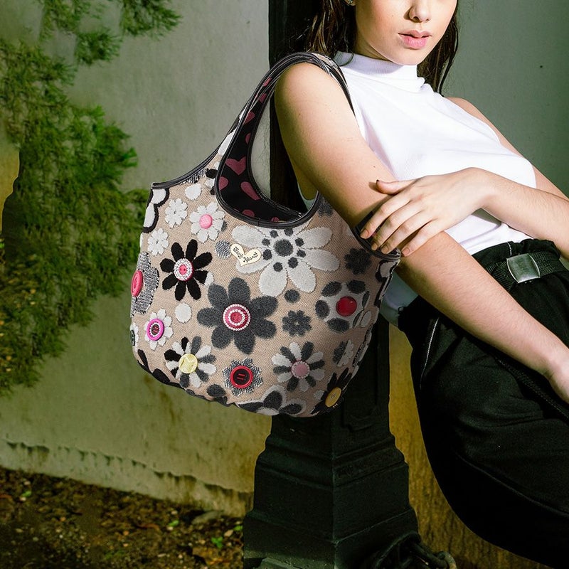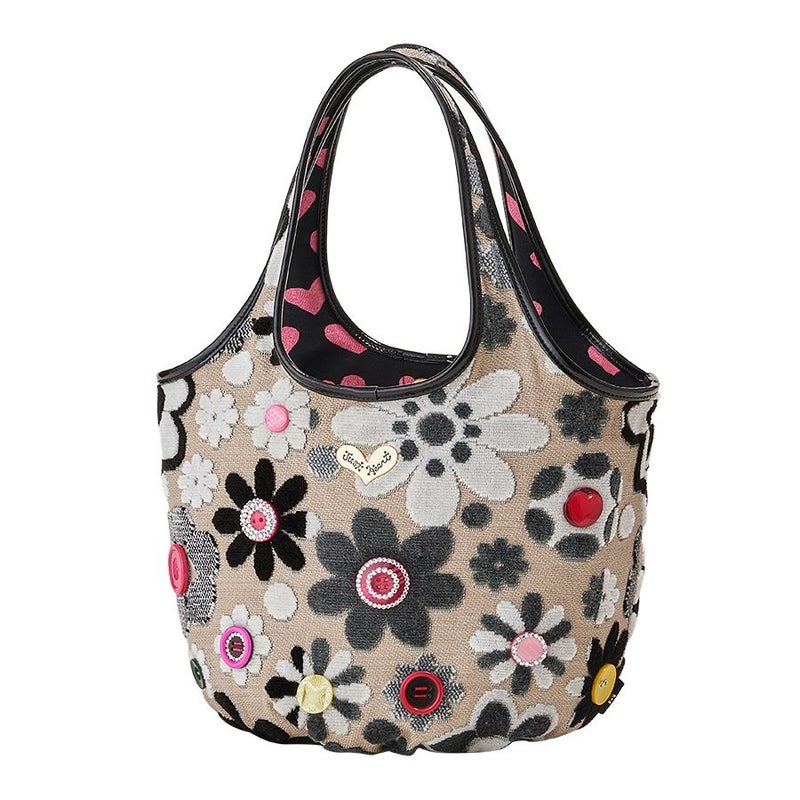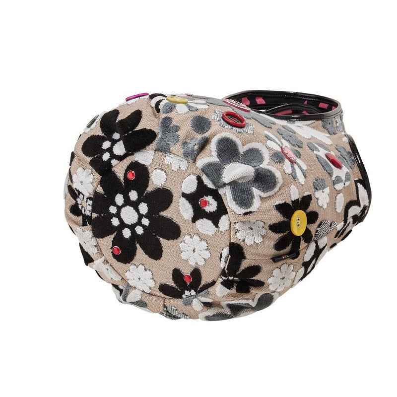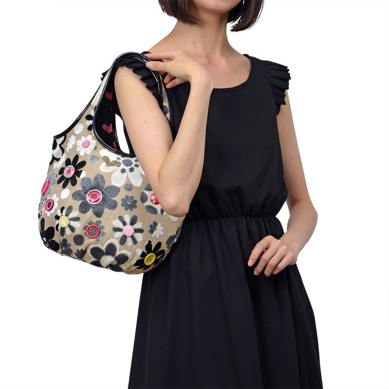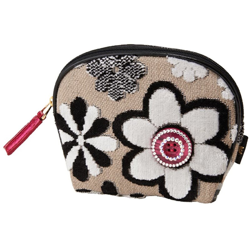 表地はパイルを凹凸に織り込んで柄を表現しているベルギー製の織物で、ふわふわとした手触りが特長。ダークベージュ地にモノトーンでシックに表現されたマーガレットの中心に配したのは、オリジナルで染め上げた11色のキュートなボタン。