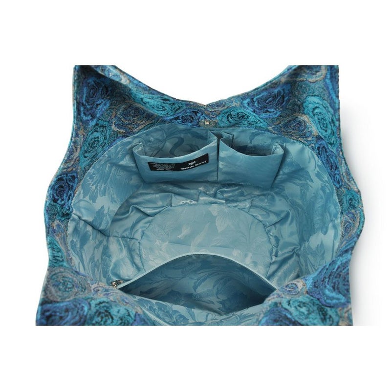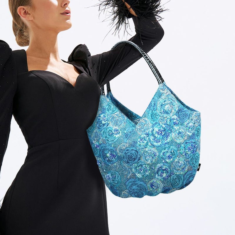 表地は鮮やかなブルーの濃淡で表現した薔薇が全面に描かれたデザイン。柄の上にはスワロフスキー・クリスタルやビーズ、スパンコールを手刺繍で繊細かつ贅沢に散りばめました。