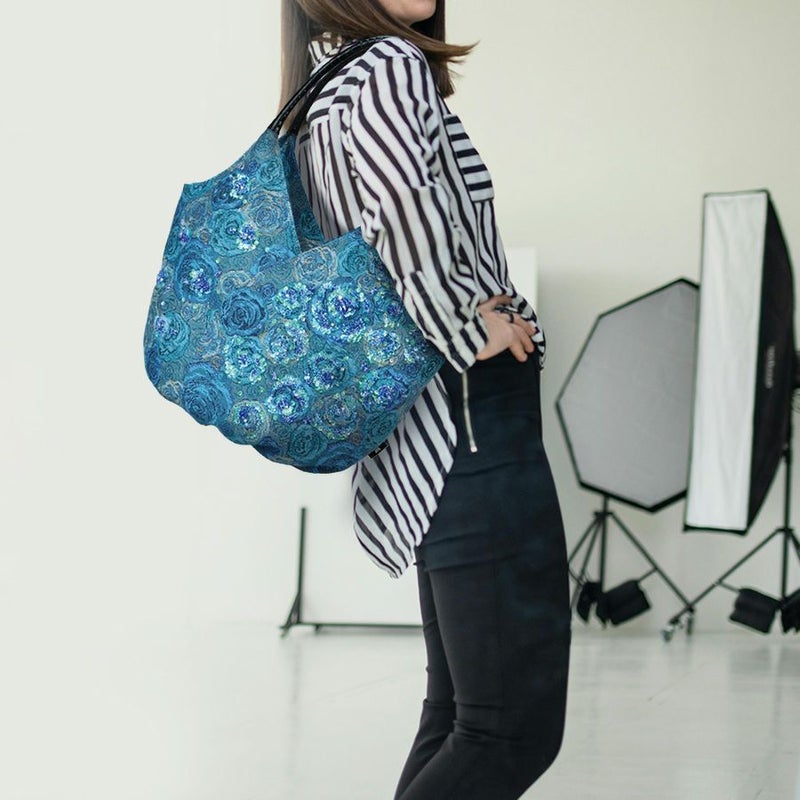 立体的に浮かび上がったブルーローズが煌めき立ち、見る角度によってさまざまな表情を織り成します。