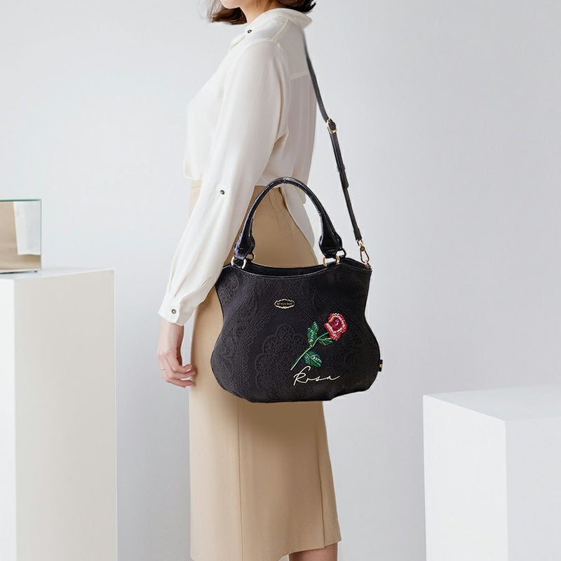 可憐なレースの繊細さを表現したさらっとした手触りのトルコ製ブラック織生地をベースに、一輪の鮮やかな赤いバラをミシン刺繍で繊細な濃淡をつけて表現。