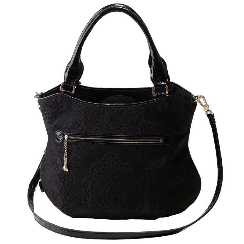 ブラックのハンドルとショルダーストラップは、高級感のある型押し牛革エナメル。