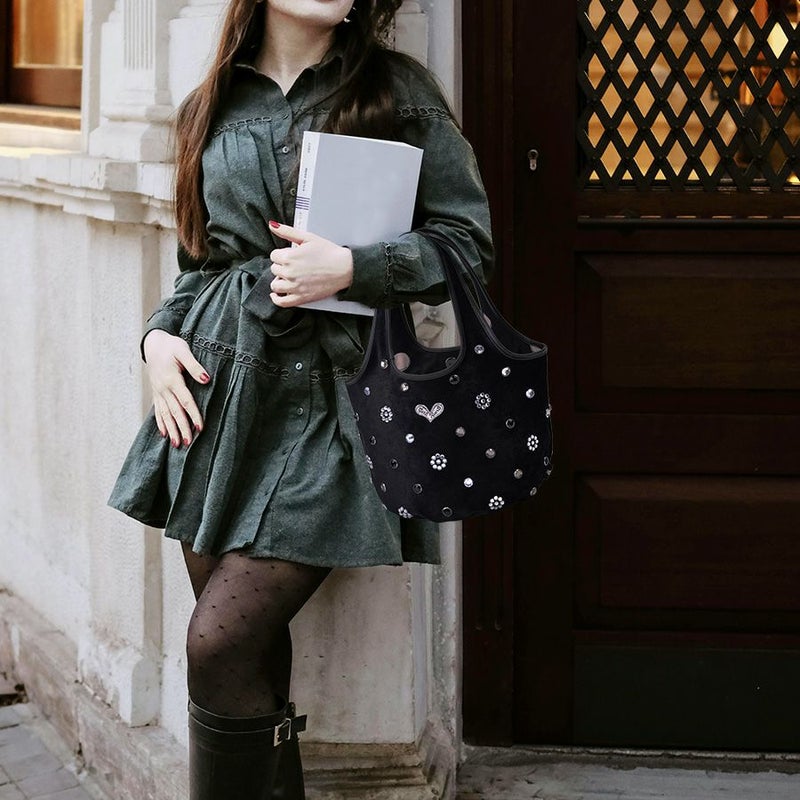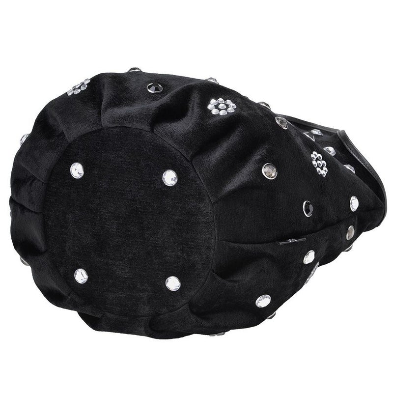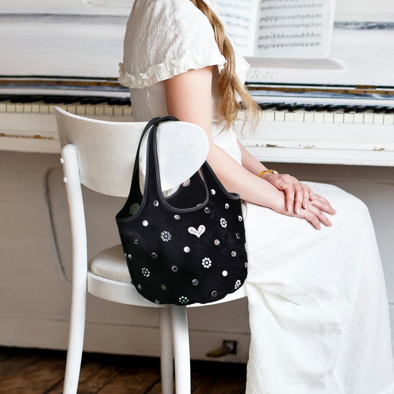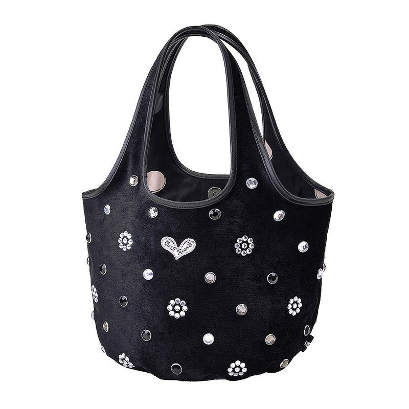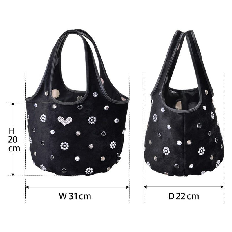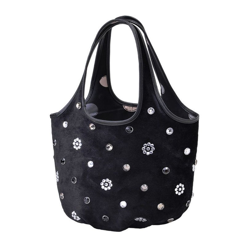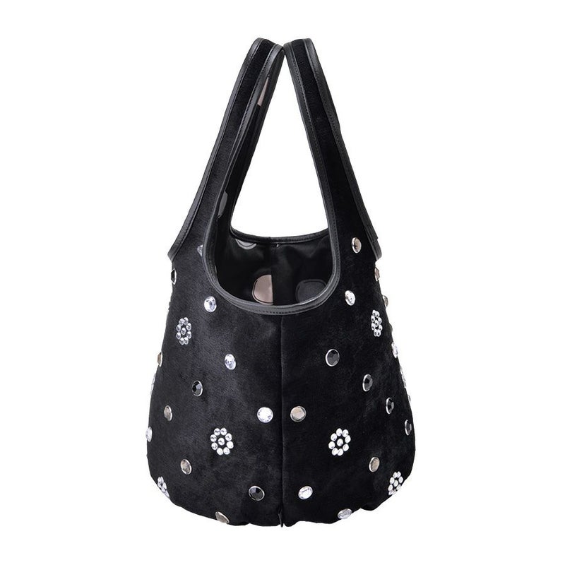 柔らかなブラック地に大粒のラインストーンとスタッズを並べたデコレーションを施しました。背面にも装飾をあしらい、どこから見ても可愛らしい仕上がりに。