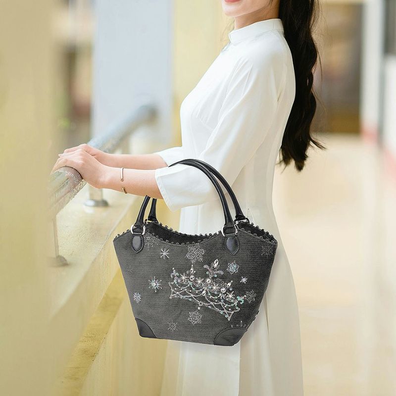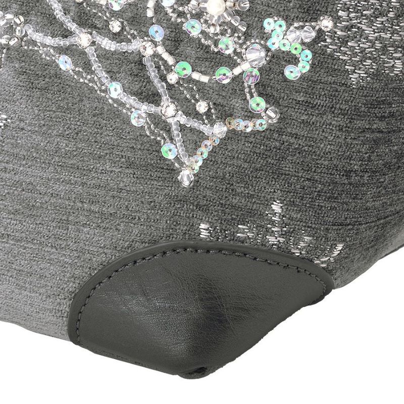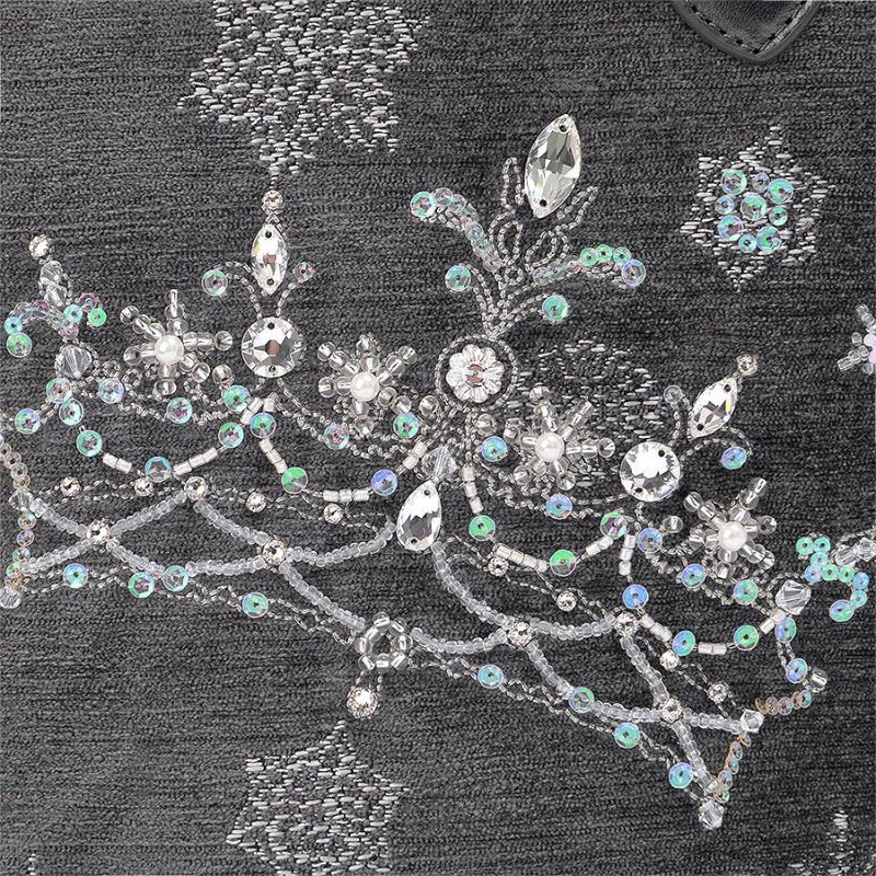 前面に描かれたティアラのモチーフはミシン刺繍で施し、さらにクリスタルガラスをメインに、パール調ビーズ、シルバーやオーロラに輝くスパンコールで煌びやかにデコレーション。透明感のある煌めきがノーブルな品格を漂わせ、まるで本物のティアラのような仕上がりです。