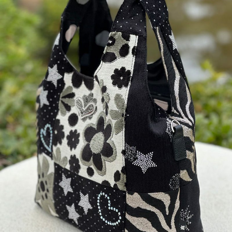 起毛感のある生地や織りの陰影が感じられる素材などをカットして繋ぎ合わせることで、