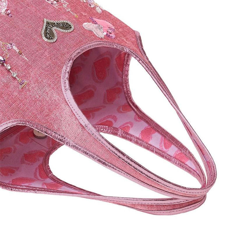 手触りの良い光沢のあるピンクのトルコ製生地に、プリンセスの弾む心の内をそのまま刺繍で表現したようなモチーフと、レザーハートをビーズやスパンコール、クリスタルガラスなどバランスよく散りばめて輝きを添え、装飾やマグネットなどのパーツには、ピンクのベースに合うシルバーを効かせました。動きにあわせて反射する光の輝きが、上品なアクセントになっています。