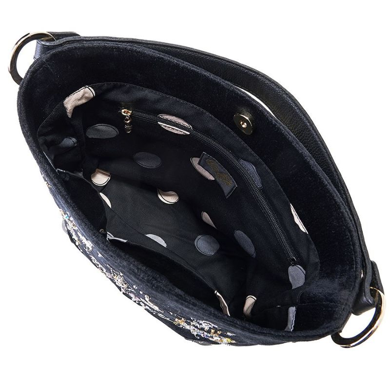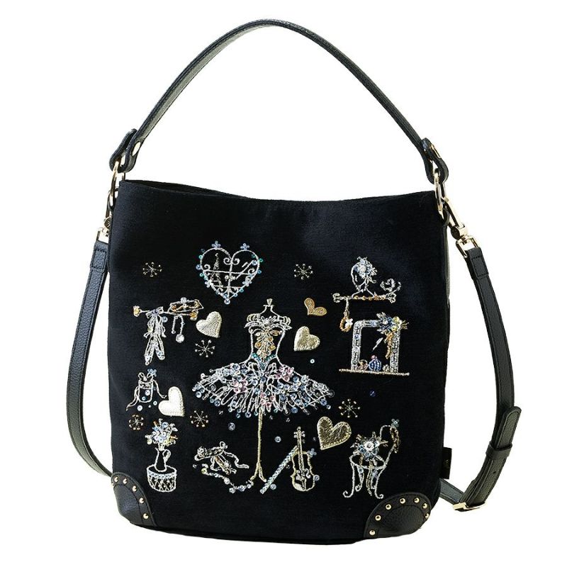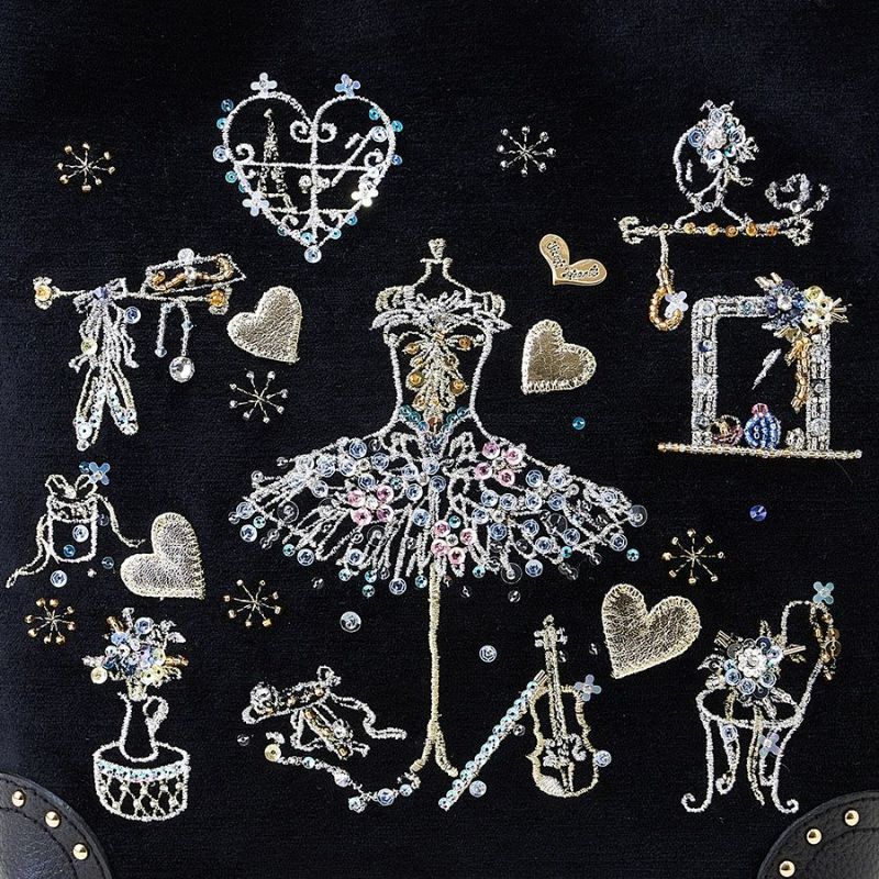 手触りの良いトルコ製の漆黒生地にプリンセスの弾む心の内をそのまま刺繍で表現したようなモチーフをビーズやスパンコール、クリスタルガラスなど、バランスよく散りばめて輝きを添えました。