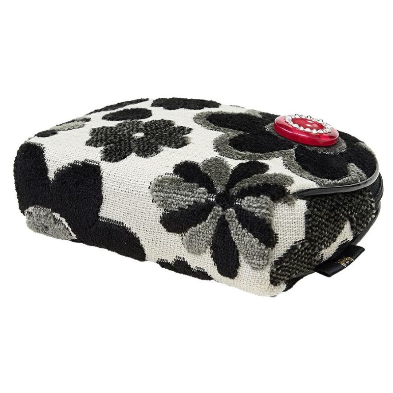 モノトーンで織り出されたマーガレットの中心に配したのは、ラインストーンやクリスタルガラスが輝くオリジナルボタン。大きさやモチーフの角度など、細部にまでこだわってデコレーションしました。