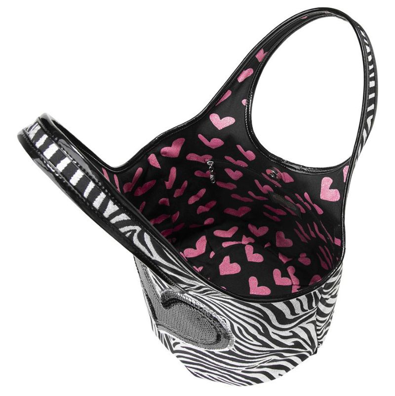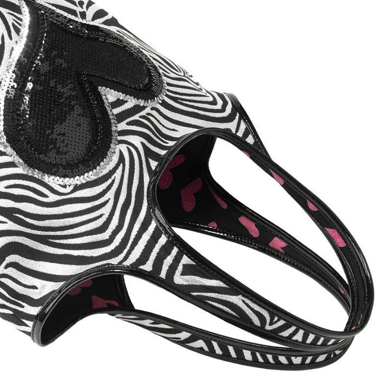 シルバー×ブラックのゼブラ柄生地に、シルバーのスパンコールで縁取りを施したブラックのビッグハートを刺繍。ゼブラとハートがキラキラ輝き、持つだけで注目の的。