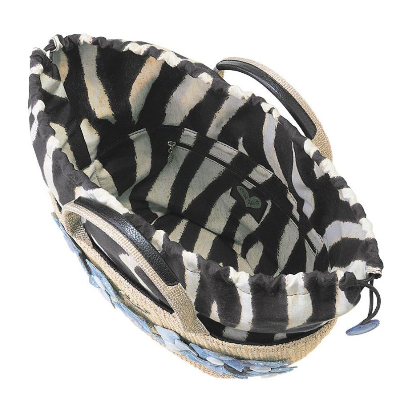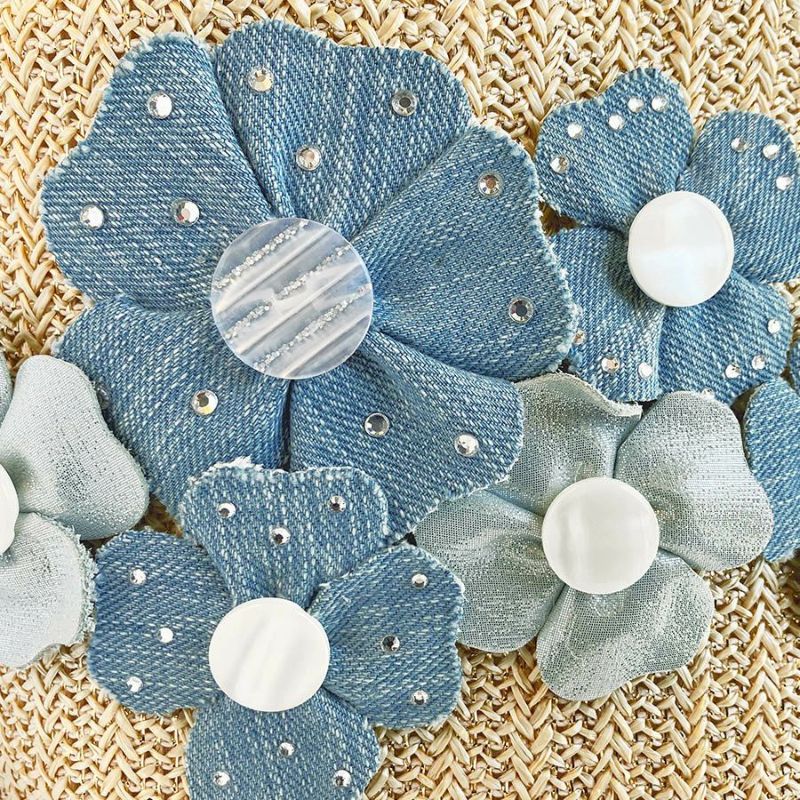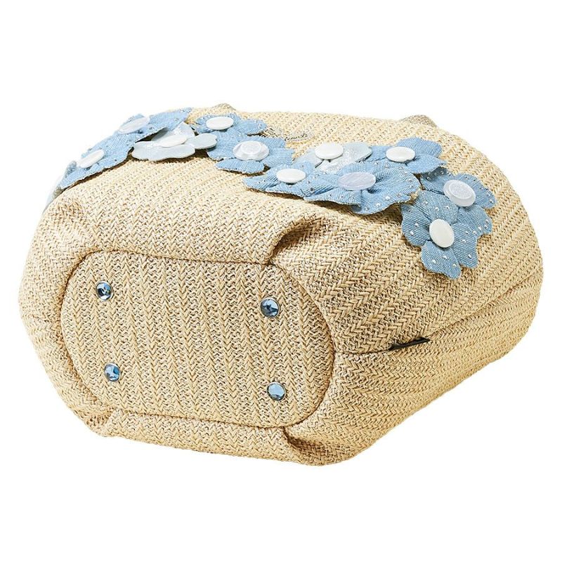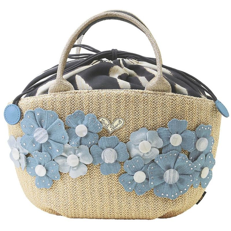 ゴールドのラメ糸を織り込んだ、さらっとした日本製のラフィア風生地に、素材の異なる爽やかなライトブルーのフラワーモチーフがキュートに咲いたカゴ風バッグ。