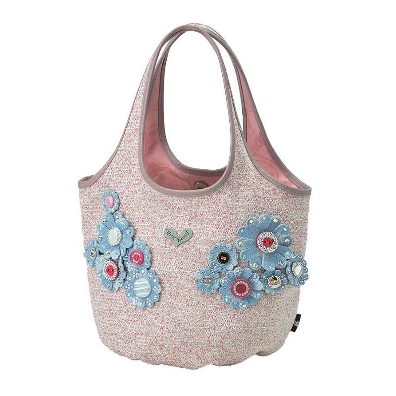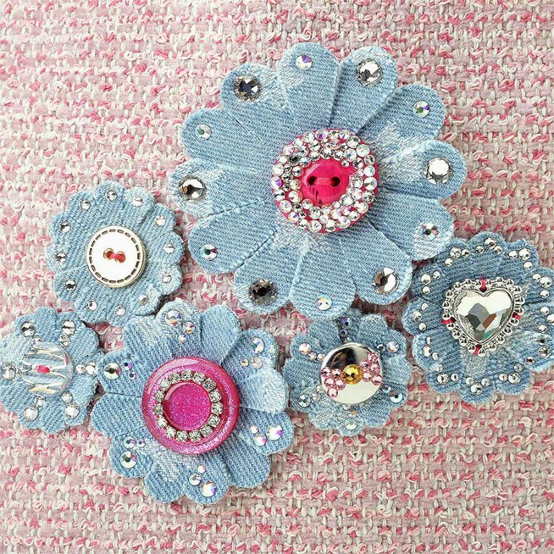 ピンク系を織り交ぜたツイード生地に合わせたのは、オリジナルデニムをベースに、煌めくオリジナルボタンを花芯に見立て、花びらにも贅沢にクリスタルガラスを散りばめたフラワーモチーフ。