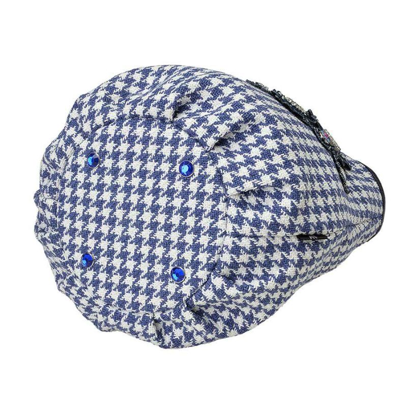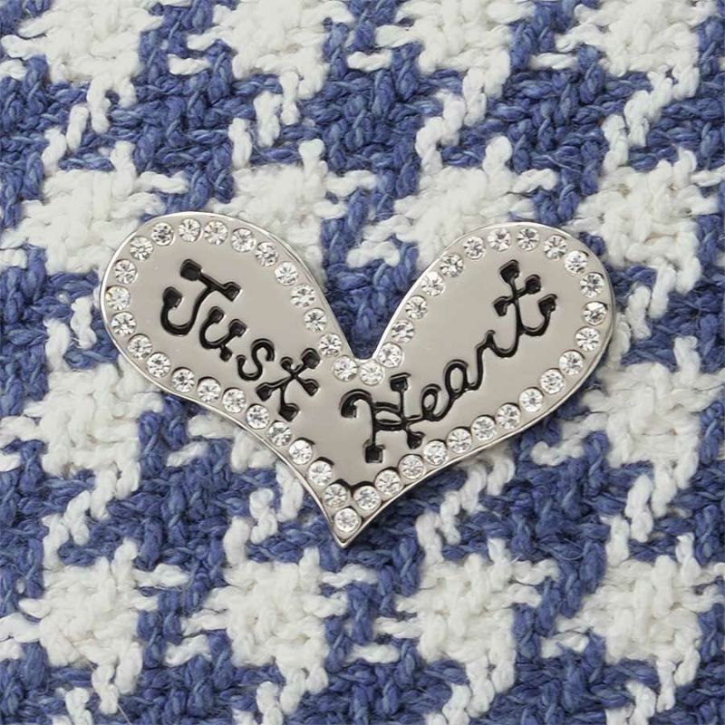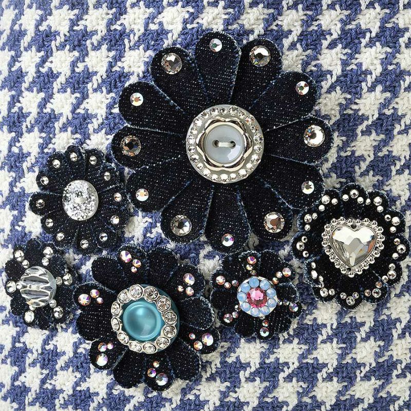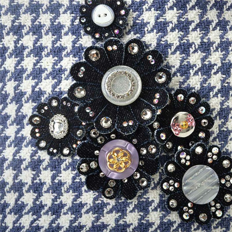 ネイビーの千鳥模様の織生地に合わせたのは、オリジナルデニムをベースに、煌めくオリジナルボタンを花芯に見立て、花びらにも贅沢にクリスタルガラスを散りばめたフラワーモチーフ。
