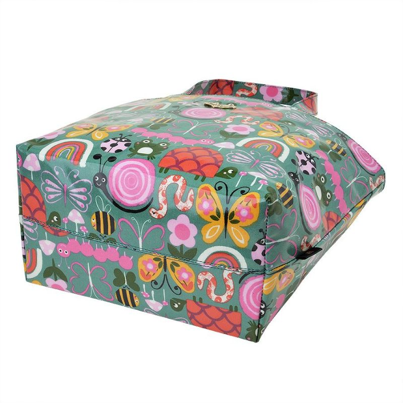 ニュアンスグリーンをベースに、絵本から飛び出してきたような昆虫やカメ・ヘビ・カエルなどが、可愛らしいタッチで賑やかに描かれています。