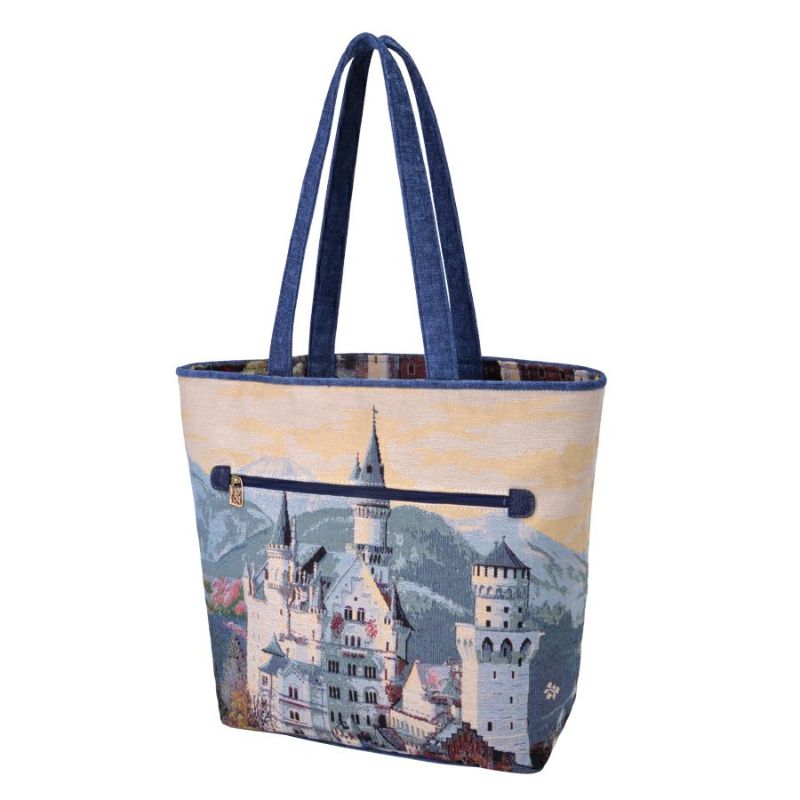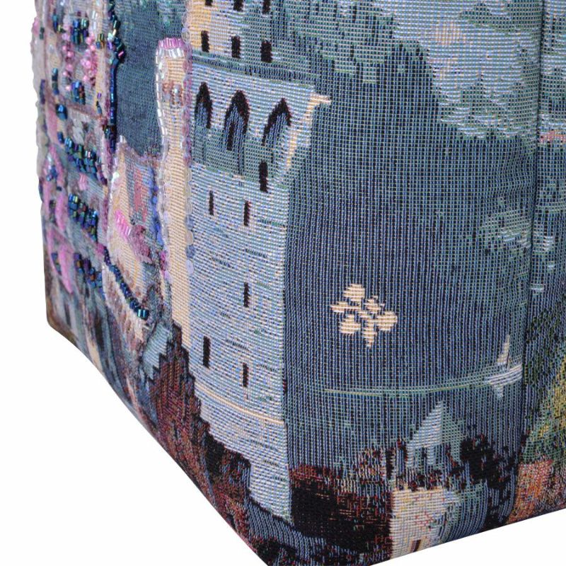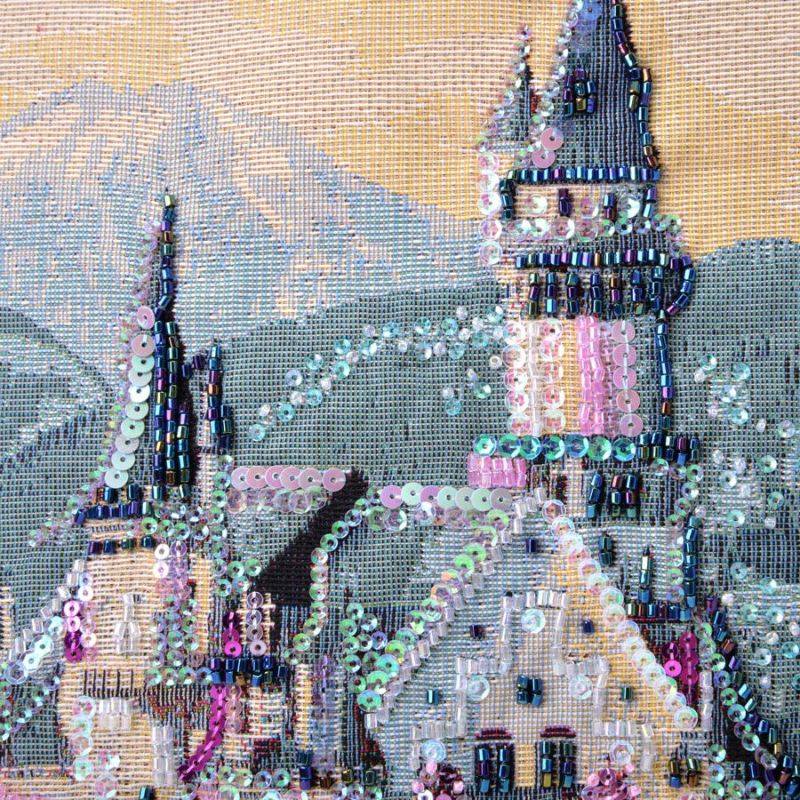 ドイツの名城・ノイシュバンシュタイン城をモチーフにしたゴブラン織に、ビーズやスパンコールを贅沢にあしらい、光の粒が舞うような輝きを添えました。