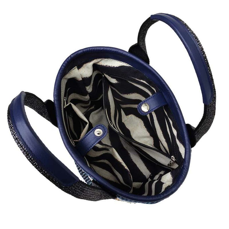 ネイビーとレッドの生地が落ち着いたベースをつくり、イタリア製ラメテープのハンドルやラインストーン底鋲がほどよい華やぎをプラス。