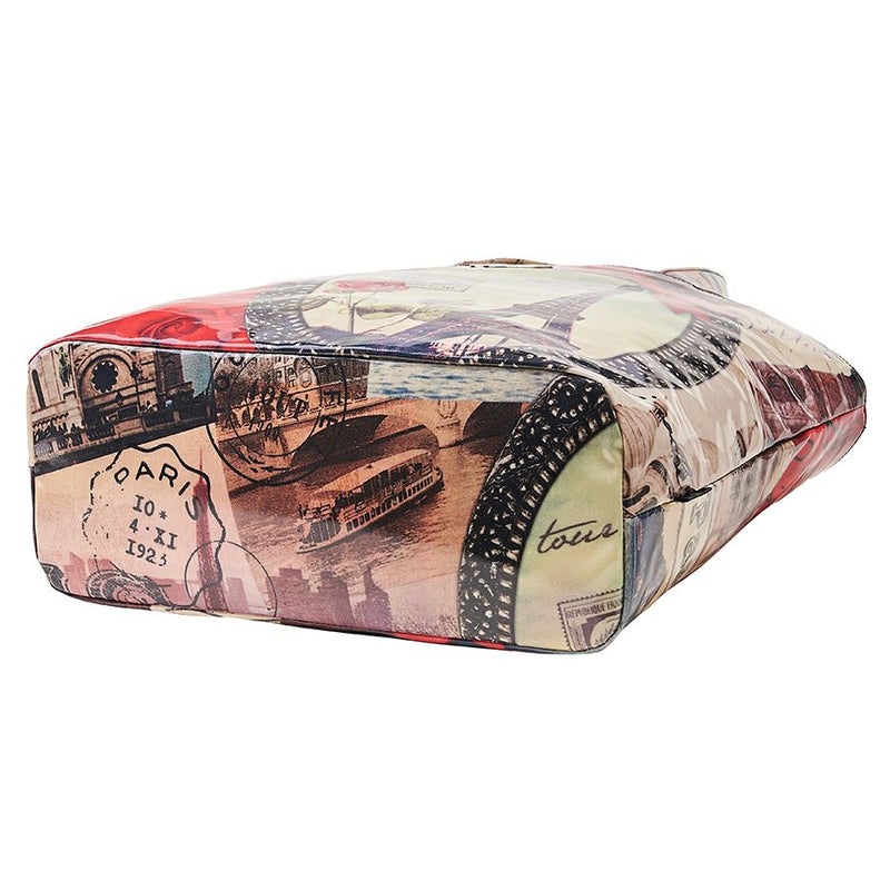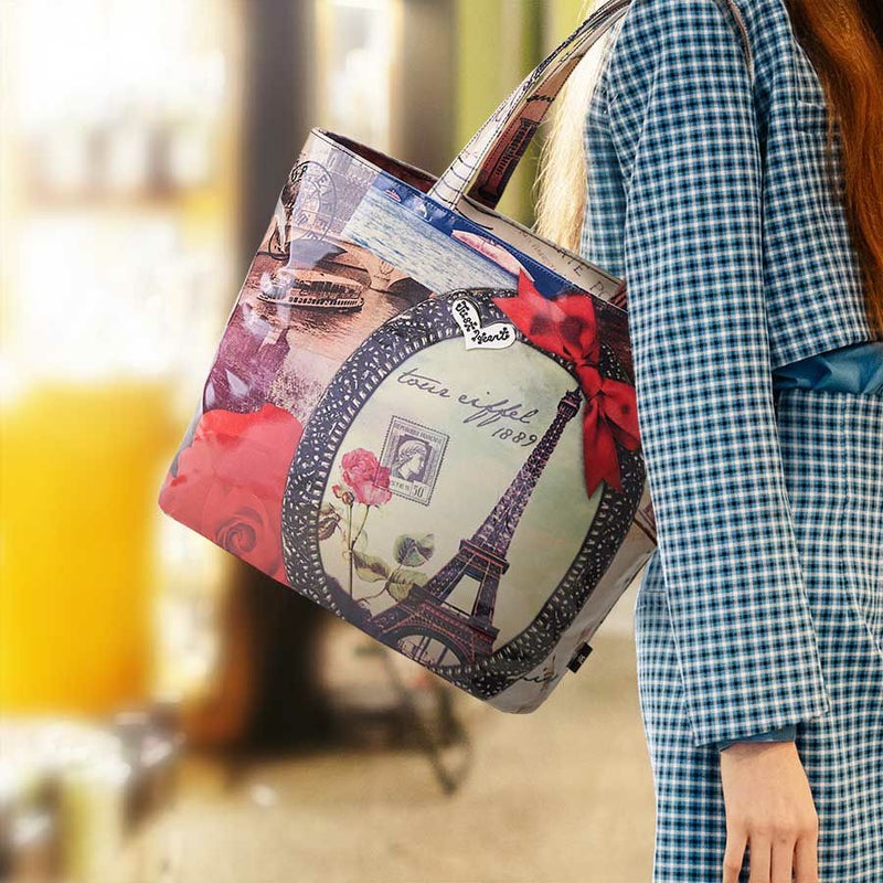 真紅の薔薇とリボンに彩られた楕円の大きな鏡に映るエッフェル塔とその存在を懐かしむように、周辺の景観がセピア色で描かれています。