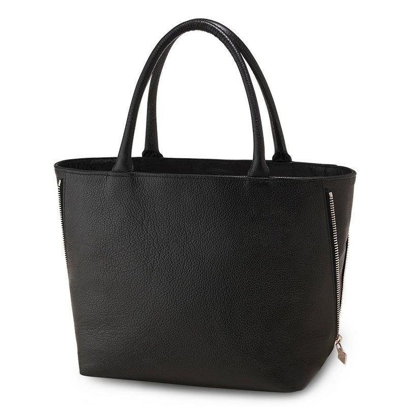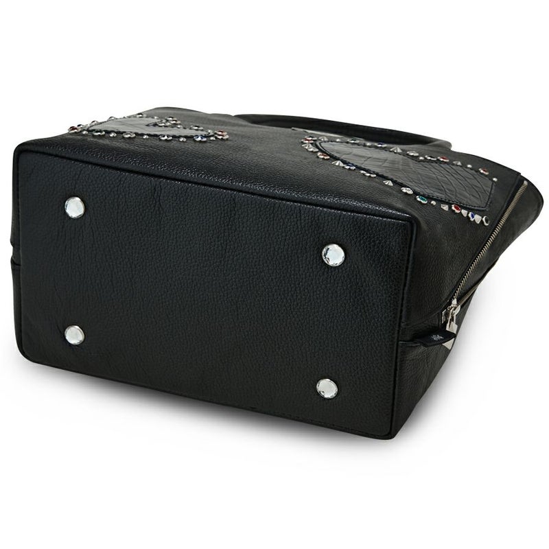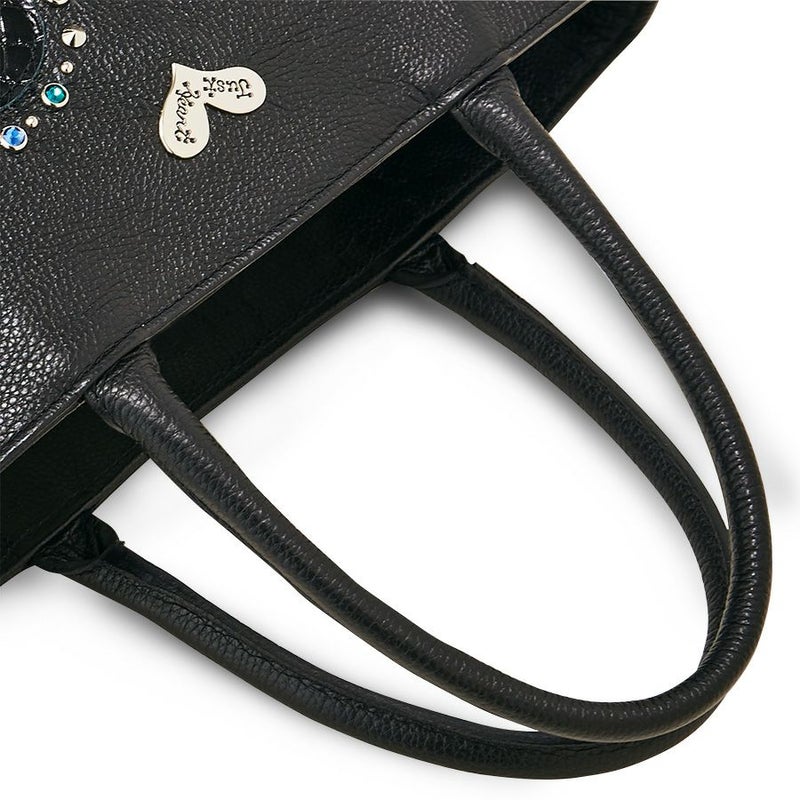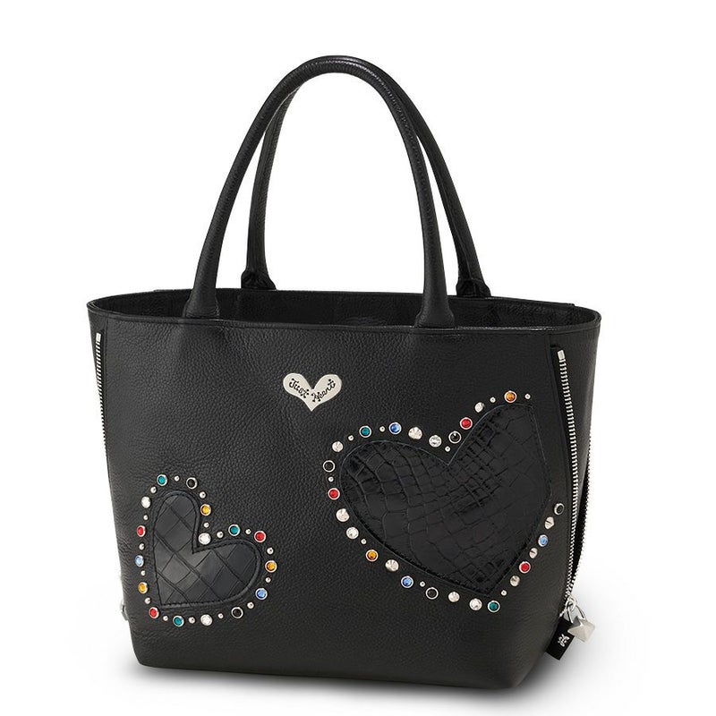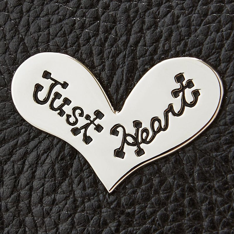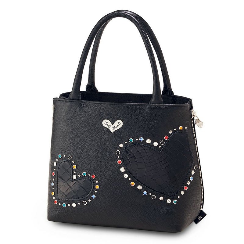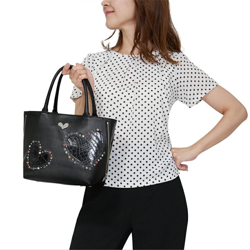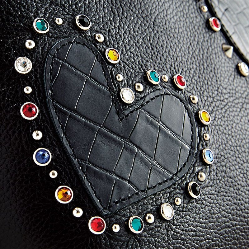 細かなシボのあるシュリンクレザーのボディに、艶のあるクロコ型押し牛革のハートをアップリケ。サイドファスナーの開閉で2通りにシルエットが変化します。ブラックレザーに合わせたシルバーファスナーがエッジの効いたラインを描き、ちょっぴりロックな雰囲気に。
