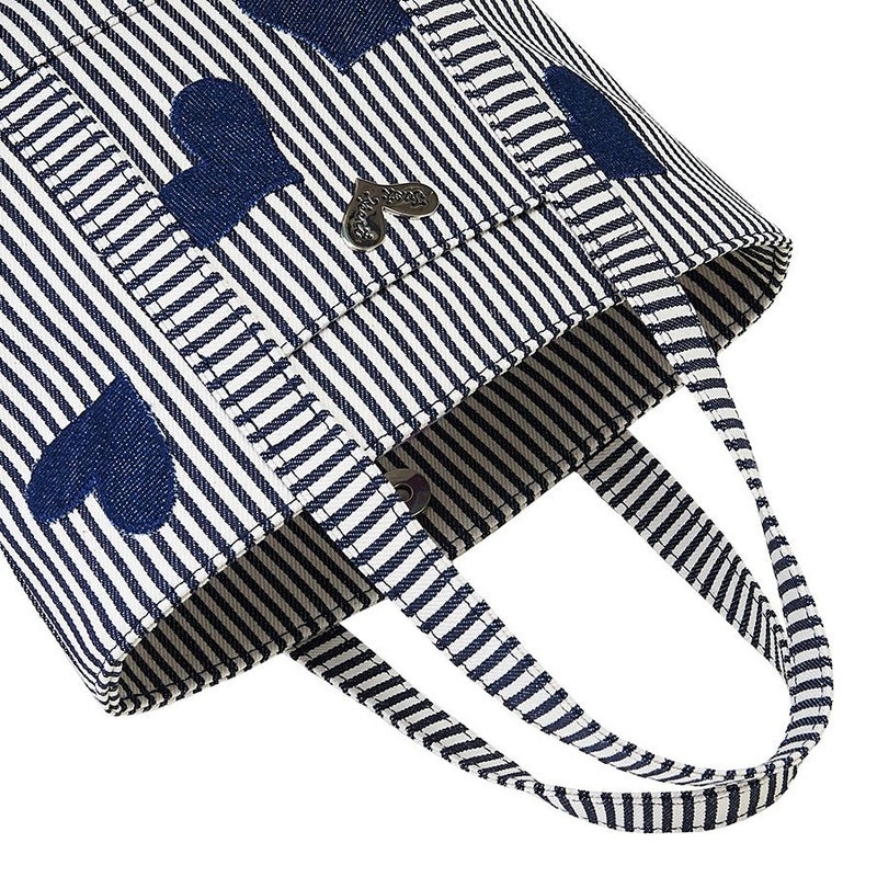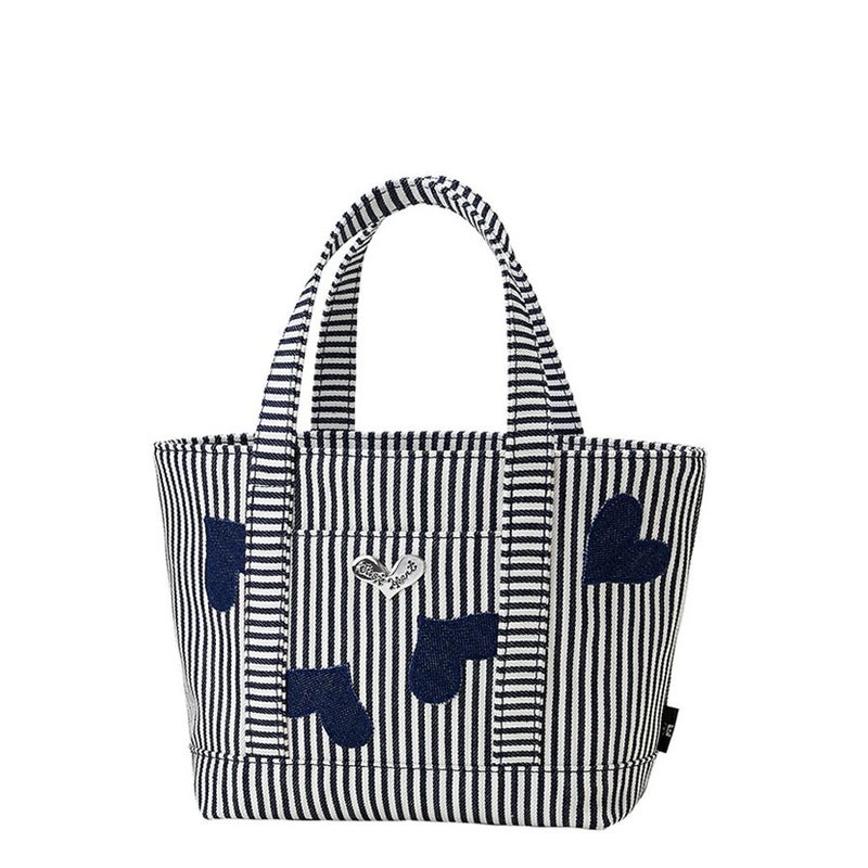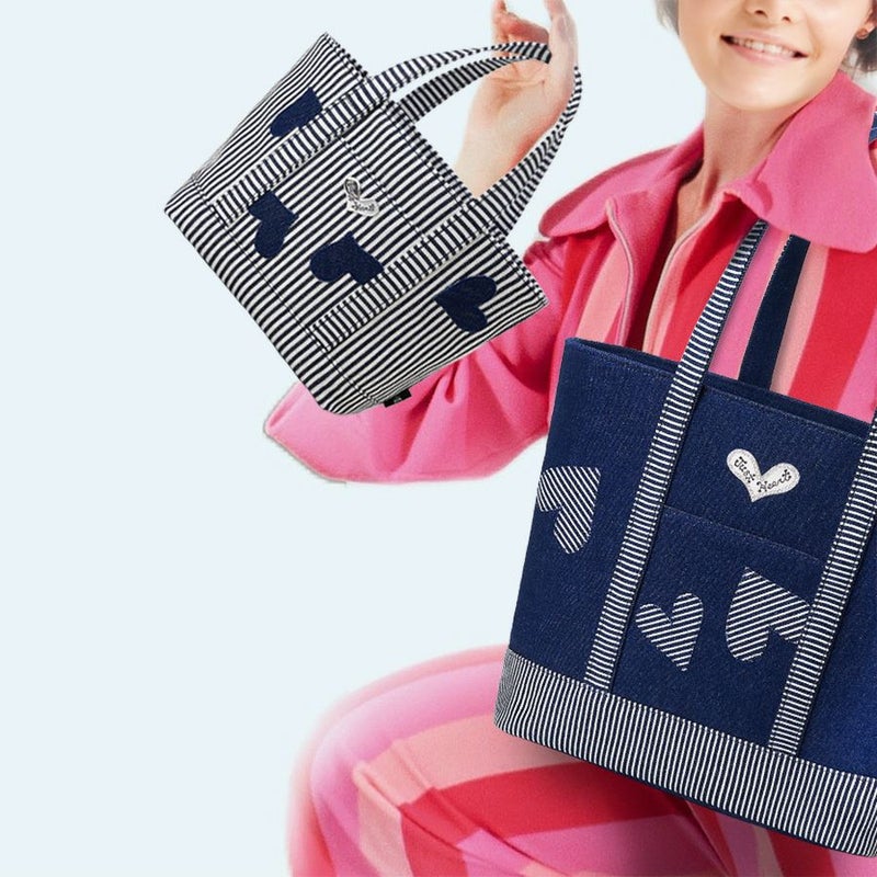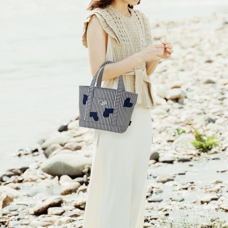 ヒッコリー(ストライプ柄に織られたデニム)に、ハートをリズミカルに配したミニサイズの爽やかなデニムトート。デニムはもちろん世界的に定評のある高品質の岡山デニムで、シーズンを問わず大活躍!