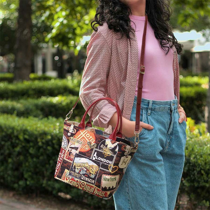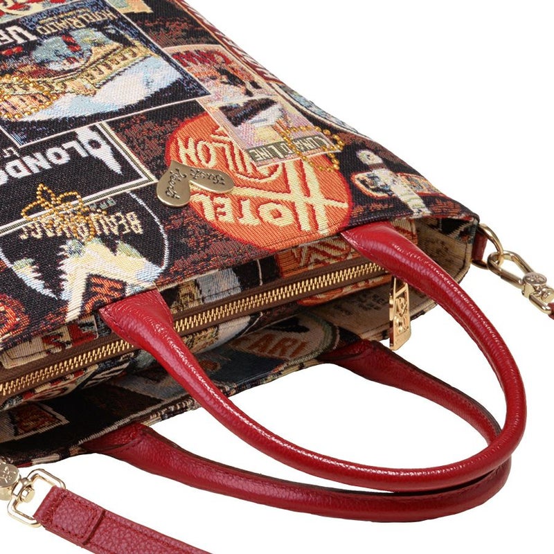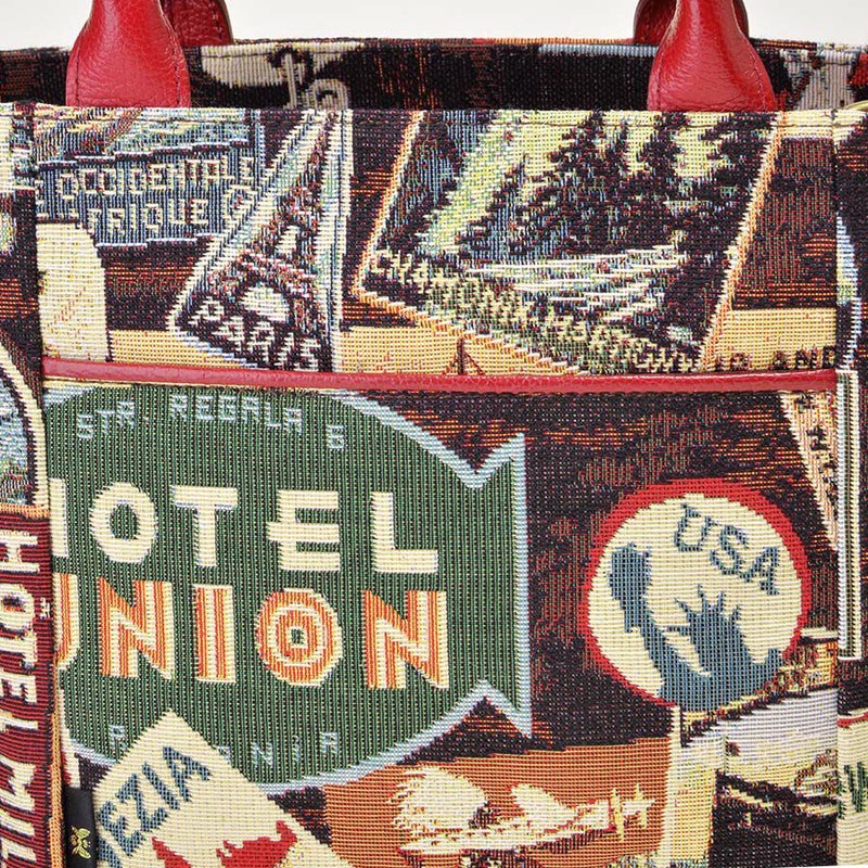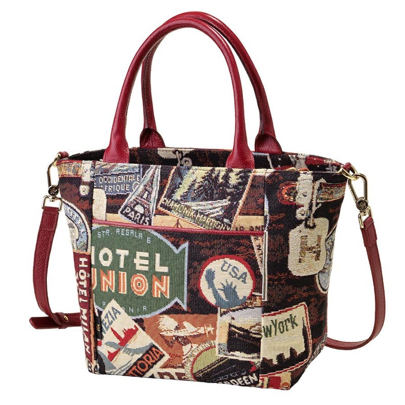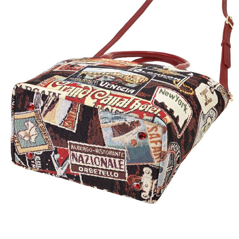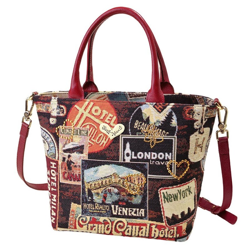 表地はスペイン製の織生地で、ブラウンベースに旅をイメージさせるワッペンがランダムに並べられた、遊び心たっぷりのデザイン。