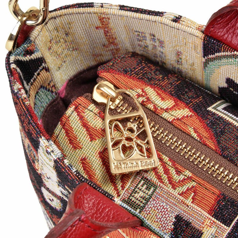 ハンドルとストラップは、表地のブラウンに合わせて深みのあるレッドカラーを採用。