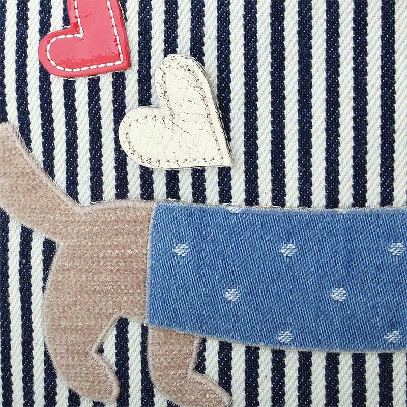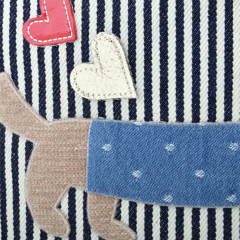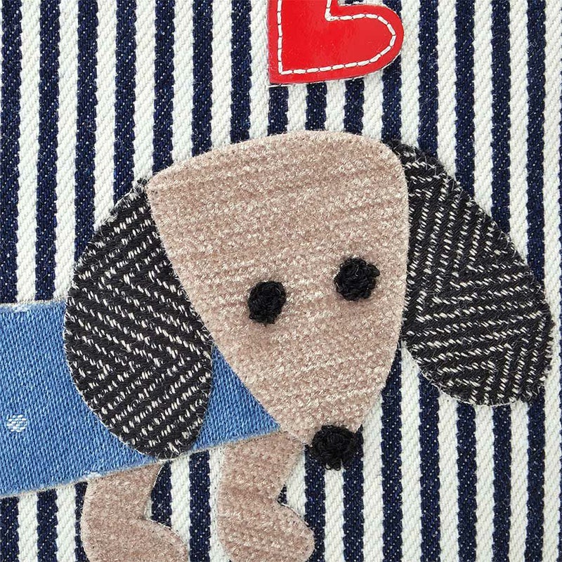 ヒッコリーデニムのボディに合わせたアップリケは、パーツを重ね合わせて仕上げ、目や鼻はさがら刺繍でふわふわと立体的に描いています。