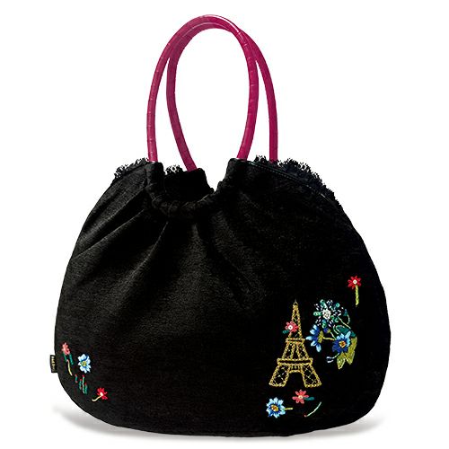 光沢感が美しいブラックの織生地に、色鮮やかに咲き乱れる花々や家並み。蝶やウサギが遊ぶ、のどかな田園風景をぬくもりのある手刺繍で描いたシリーズ。