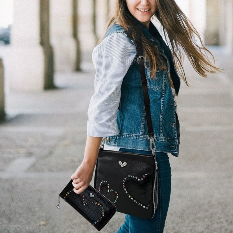 シボのあるブラックの牛革をベースに、艶のあるクロコ型押し牛革のハートをアップリケ。