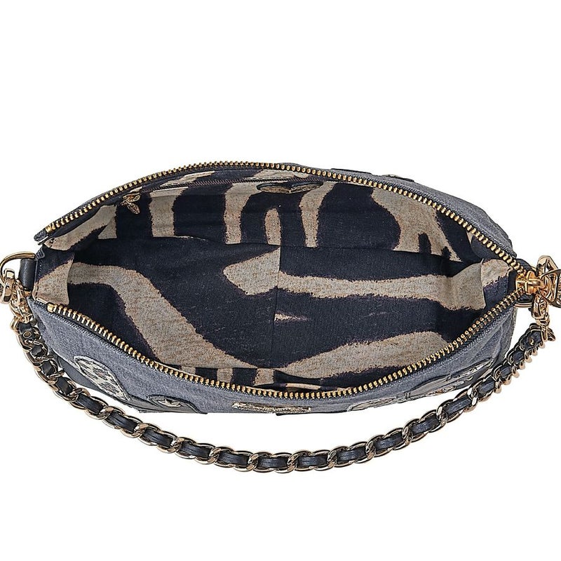 中を開けるとインパクトのあるゼブラ柄が顔を出すサプライズ。開口部は端まで大きく開くファスナー式で、出し入れラクラク。