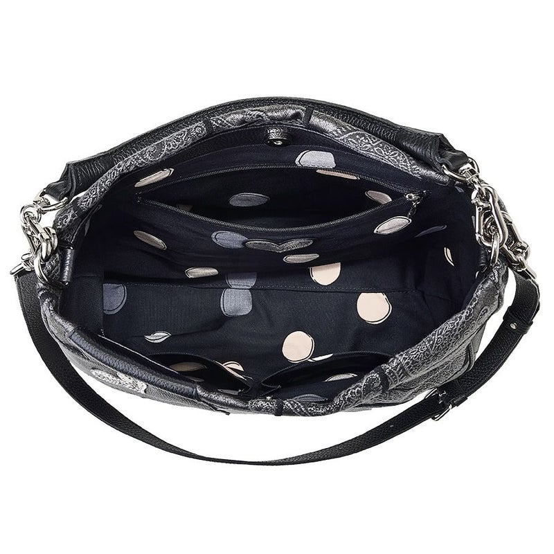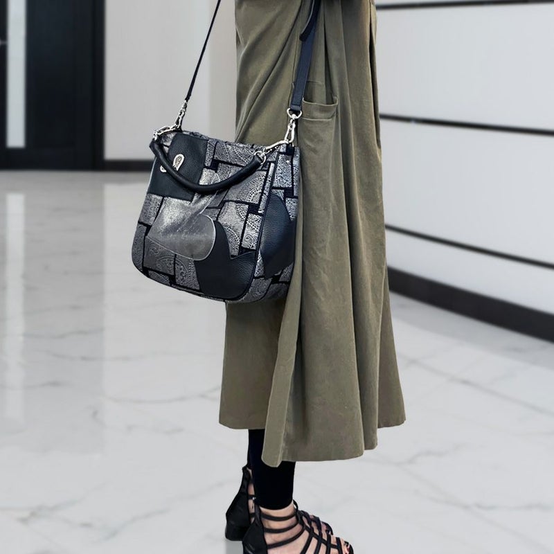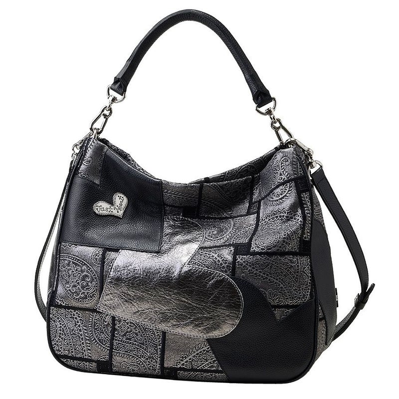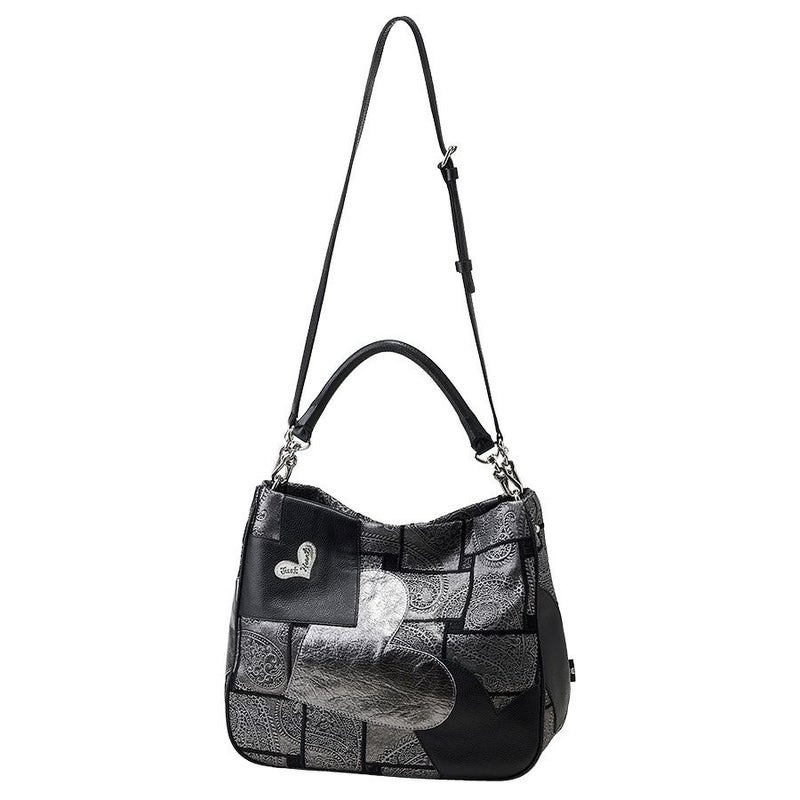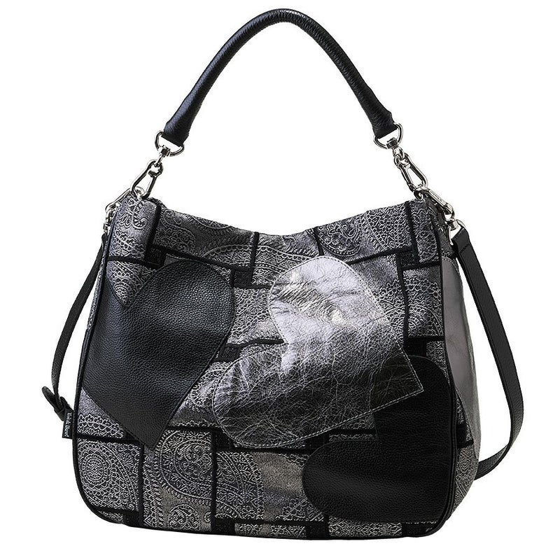 独創的な生地に、ブラックとメタリックハートの柔らかく、しなやかな牛革をパッチワークした立体的で個性的なデザイン。上質で洗練された大人のエレガンスを演出してくれます。