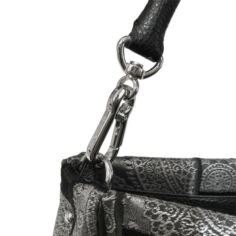 ボディの上品な光沢を放つペーズリー模様は、シルバーとブラックの糸で立体的に表現された繊細で美しい織生地。その上に黒糸で直線的な刺繍を二次加工で施すことで生地の印象ががらりと変わり、幅広のリボンを編み込んだような独創的なデザインに。